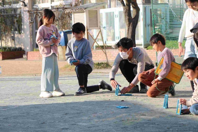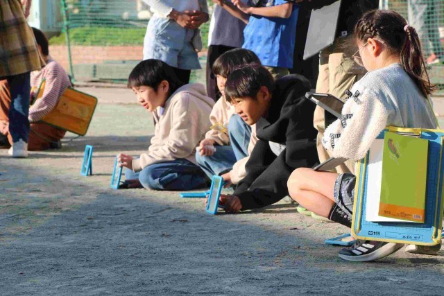 ねらってねらって、真剣な眼差しでしっかり的に光を当てて、温度計の温度を測っていました。上手です!