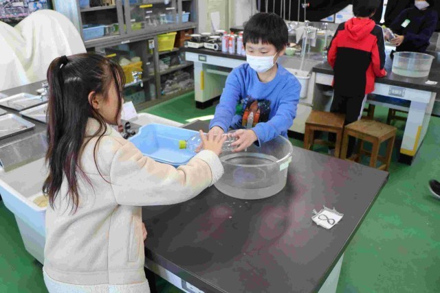 「空気の温度を変えると体積は変わるのか」実験をしていました。50度のお湯と5度の水の中にペットボトルを入れて比べました。