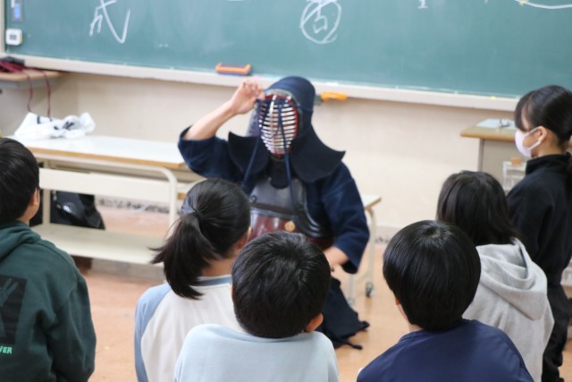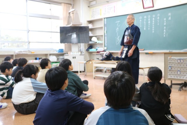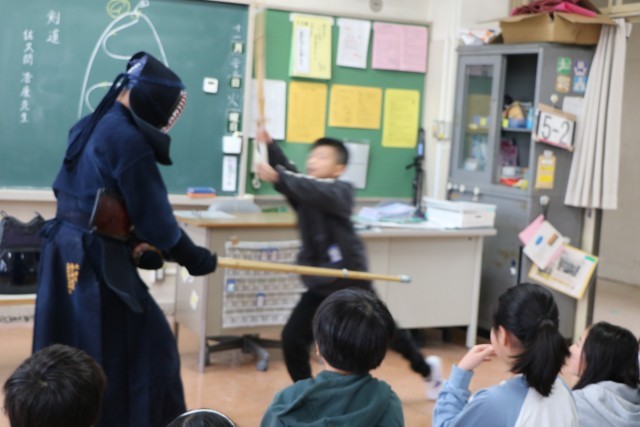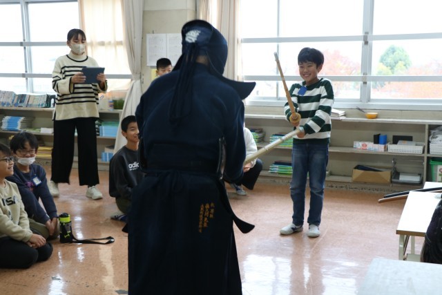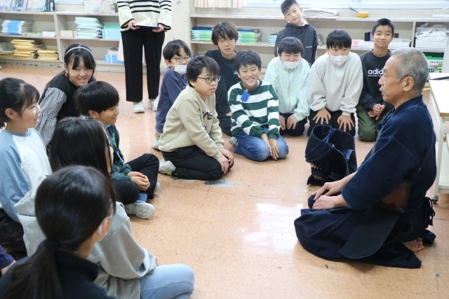 写真は剣道の様子です。先生のもとで日頃からけいこを頑張っている子の声や動きを目の当たりにし、いつもの友だちの様子と違う姿に感動する子どもたちでした。そして、竹刀を握ったこともない子どもたちにも、体験させていただきました。