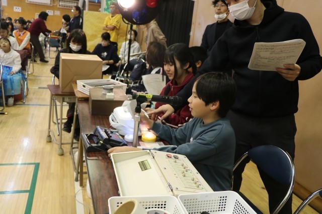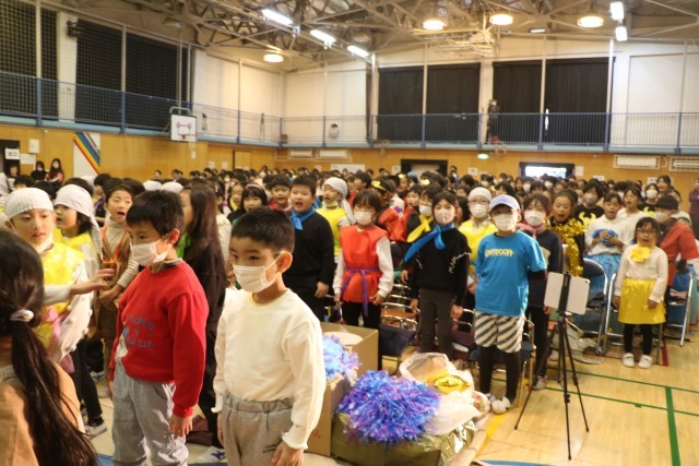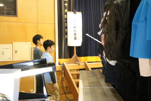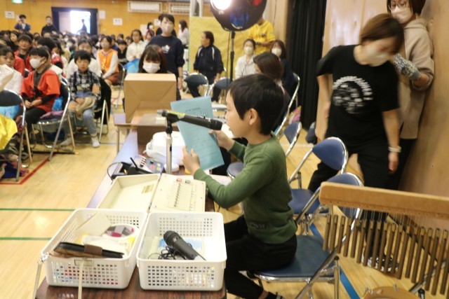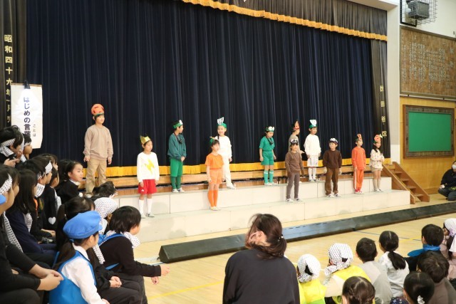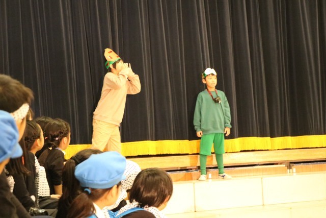 全校で幕を開ける歌、1年生の学芸会実行委員8人のはじめの言葉から始まりました。今日の進行アナウンスは5・6年生の放送委員がしています。舞台上にあるプログラムも5・6年生代表委員が出し入れをしています。学年の自分の役割以外にも頑張っている高学年のおかげで、スムーズに進行しました。