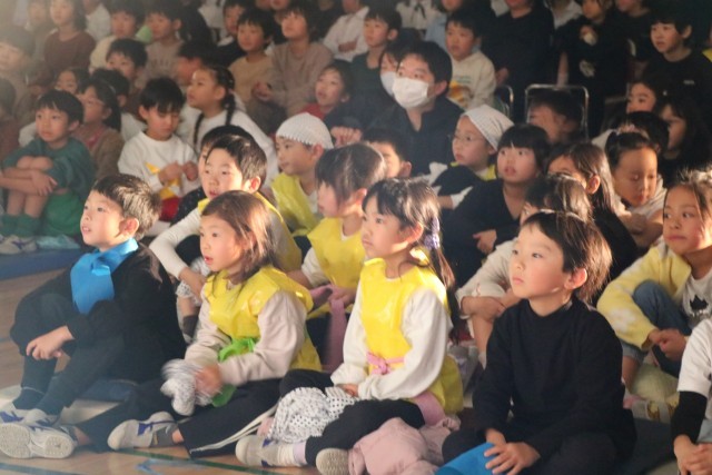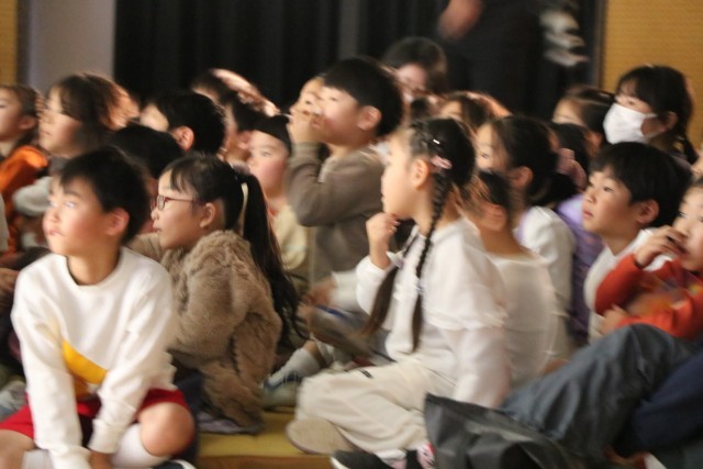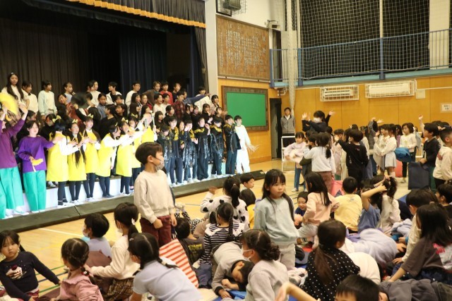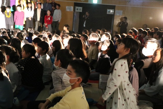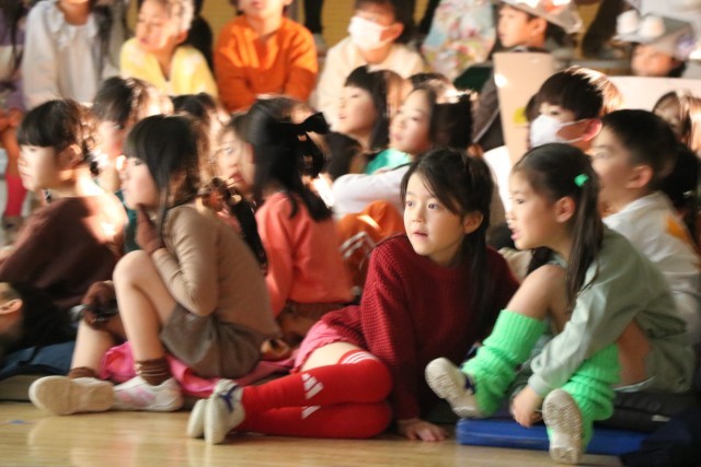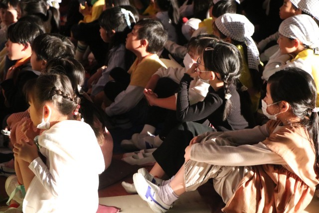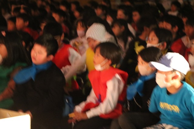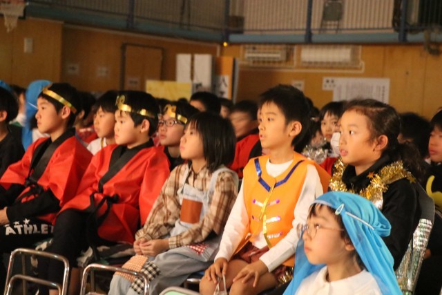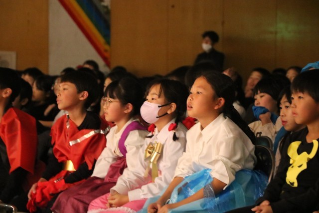 昨日のリハーサルは、当然のことながら私たち大人が数名いる中で観客なしで行っています。終わると精一杯拍手をしましたが・・・今日は体育館には全校児童が入っています。子どもたちは、自分以外の学年の演技を本当に!真剣に!観ています。笑うところは大声で笑い、ドキドキするところでは耳をふさぎ思わず「キャー」とか「あ~そっち行っちゃだめ~」などと声を出しながら観ています。大好きな、なるとダンスが出てくれば大喜びで一緒に踊り出す子もいます。拍手や手拍子もたくさんあります。さらにノリノリで演技する子もいます。体育館が一体となりとってもいい雰囲気の学芸会1日目でした。