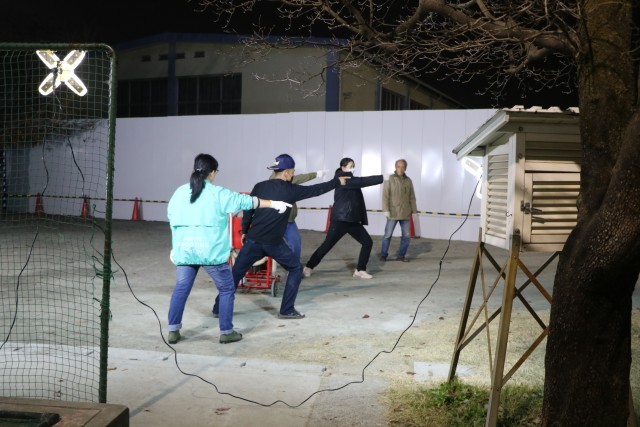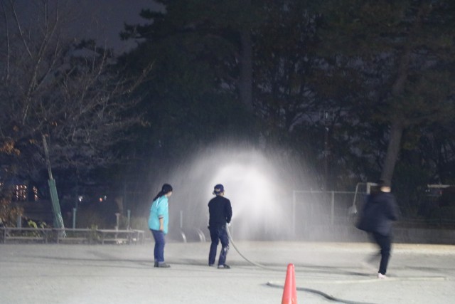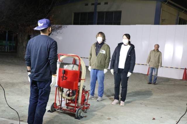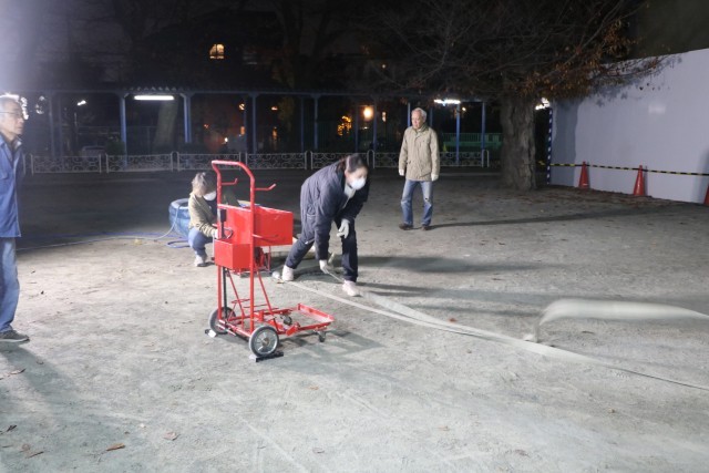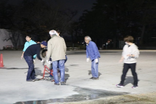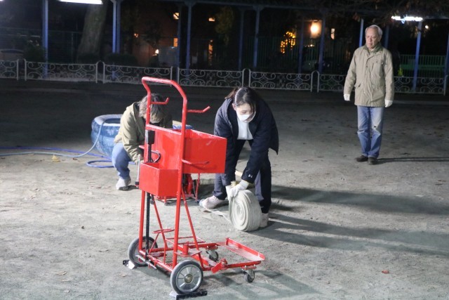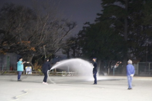 12月7日(日)に、D級消火ポンプの実技大会が多摩川河川敷で実施されますが、喜多見上部自治会を代表して砧小学校チームが参加します。夜仕事が終わってから校庭に集まって、熱心に練習をしている様子です。