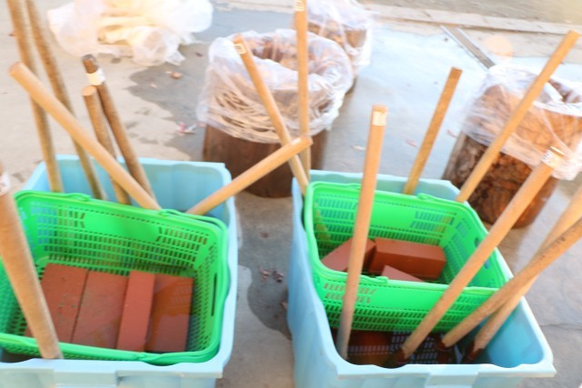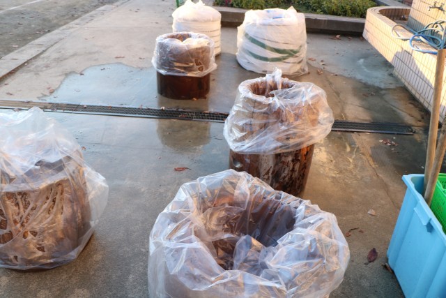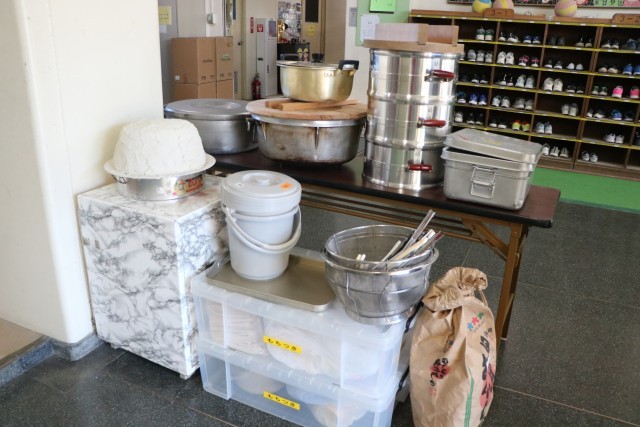 学芸会が終わってすぐ、臼や杵を水につけたり、羽釜の外側にクレンザーを塗ったり、餅つきの準備を着々と進める主事さんです。子どもたちは