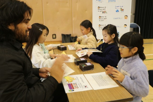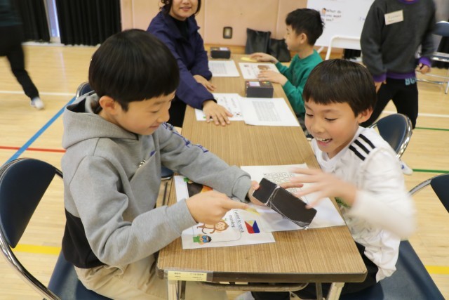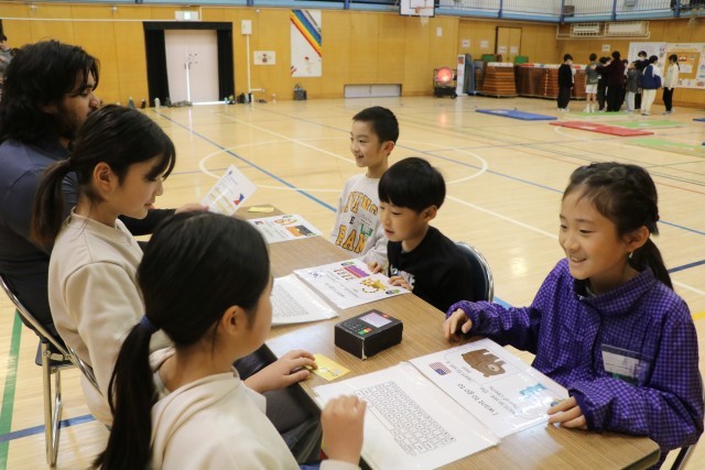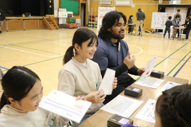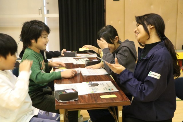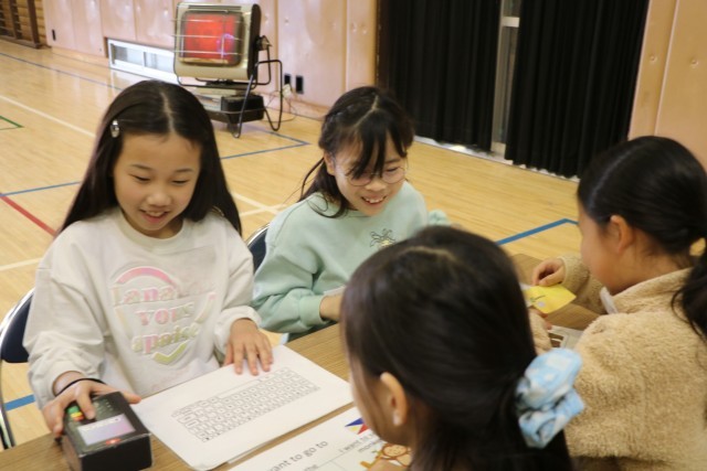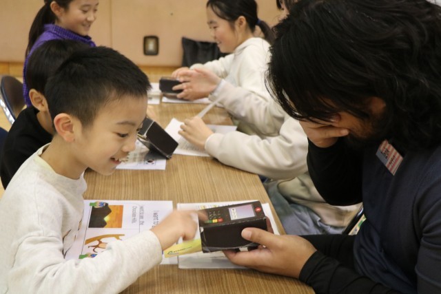 飛行機のチケットを買うには、カウンターでどこの国に行きたい、何が食べたい、どんな遊びをしたいなど、リクエストをしなければなりません。そしてチケットを購入となったら、キャッシュレス決済なのです!カードをカードリーダーに入れて、暗証番号は見られないように押します。