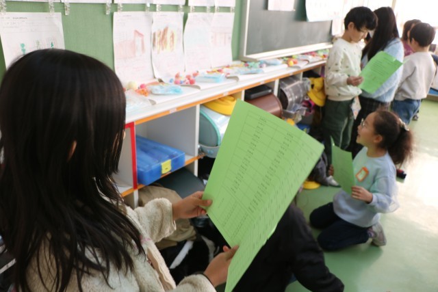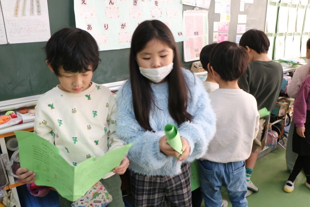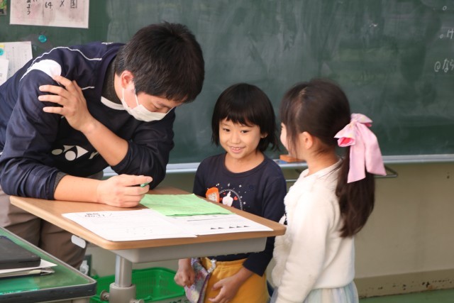 2年生算数の様子です。担任の先生とT2の先生にかけ算九九を聞いてもらっています。合格するかドッキドキです。