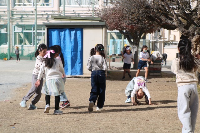 今日は中休みが低学年、昼休みが高学年の外遊びでした。思い思いの遊び、お喋り、日向ぼっこを楽しみながら過ごしています。