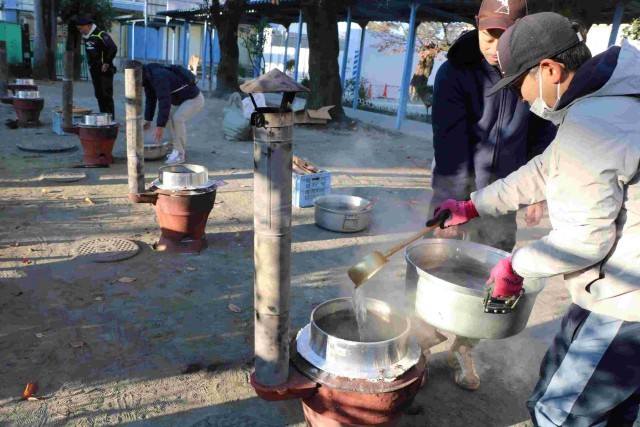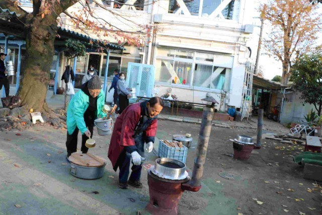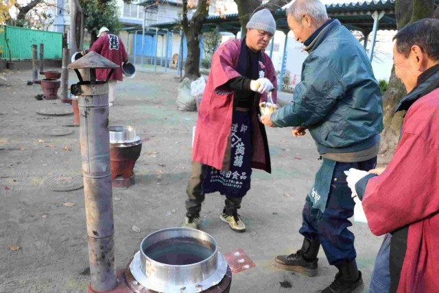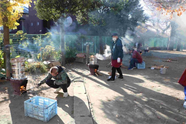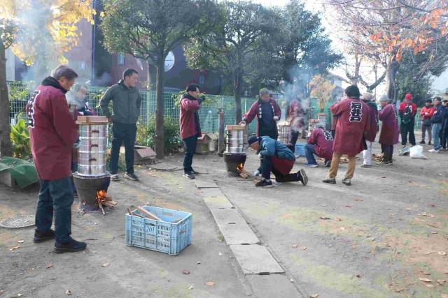 今年も石井戸会の方々が、お清めの後、かまどに火をおこしてくださり、始まりました。