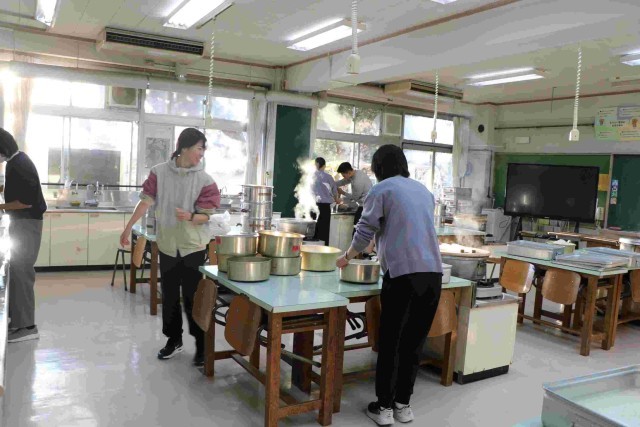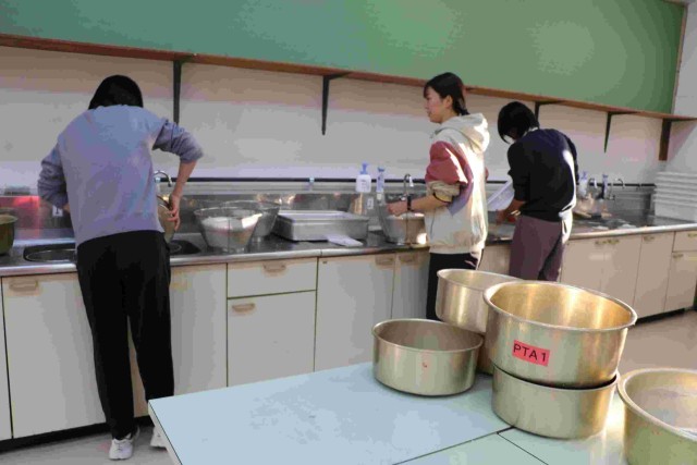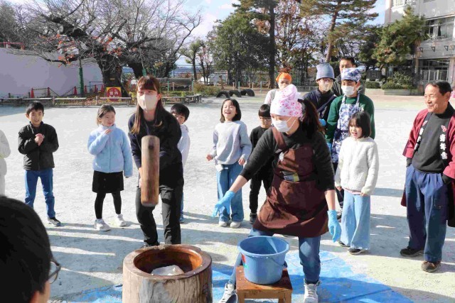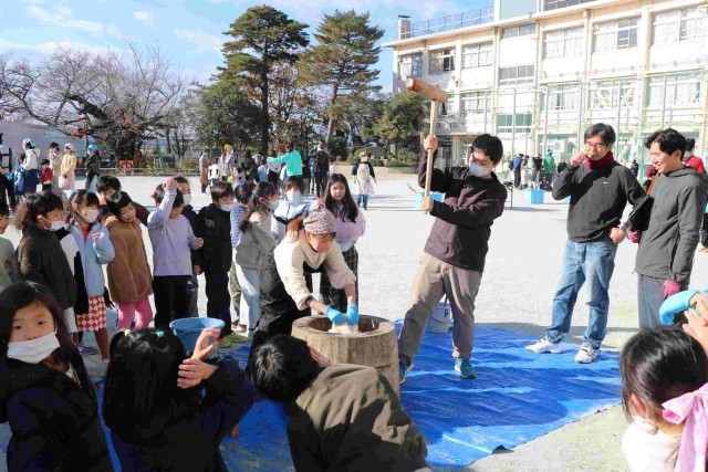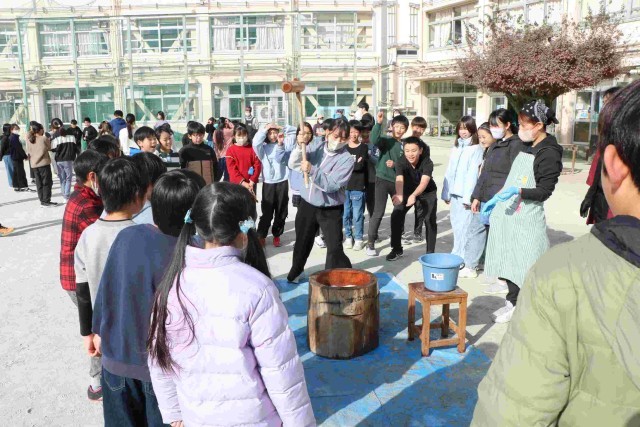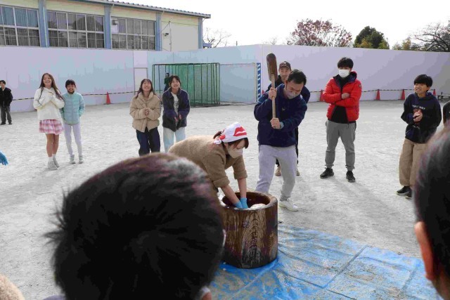 前日は放課後に米とぎをしてくれた先生方、今日は早めに出勤してその米の水を切って蒸し器に移したり、校庭の用意をしたりと、総出で準備してくれました。もちをつく時には、クラスの子どもたちからの盛大なる声援が!