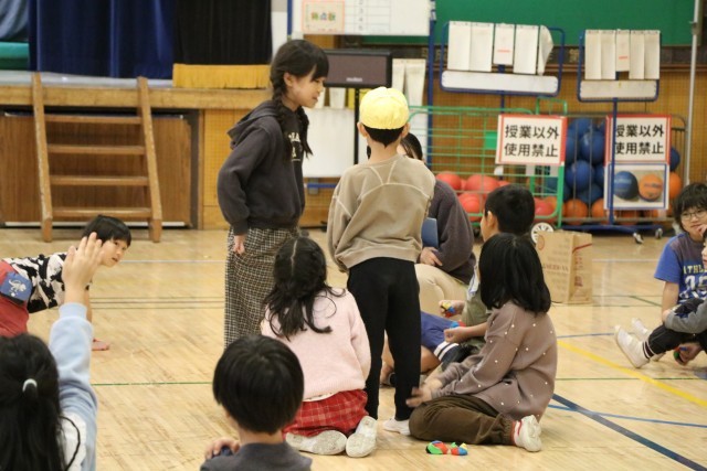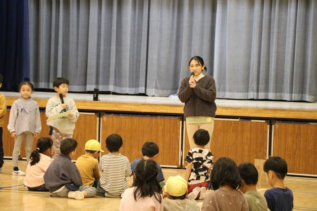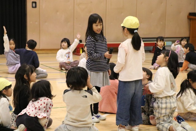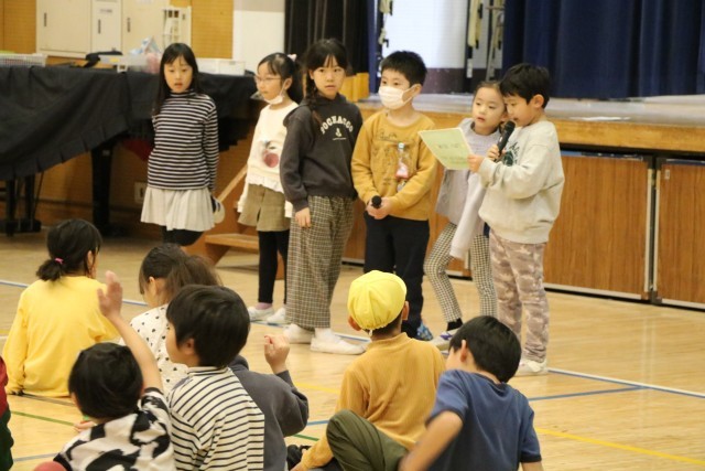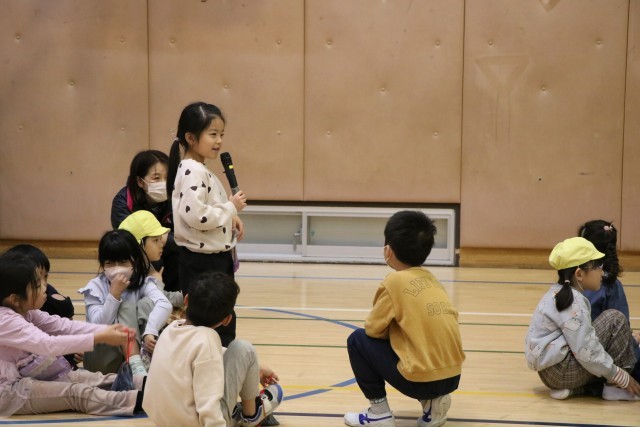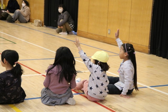 司会の1年生の声で、お手玉遊び、今日の振り返りの時間です。「楽しかったことは何ですか」という問いかけに1年生も幼稚園のお友達もたくさん手が挙がり発言しています。
