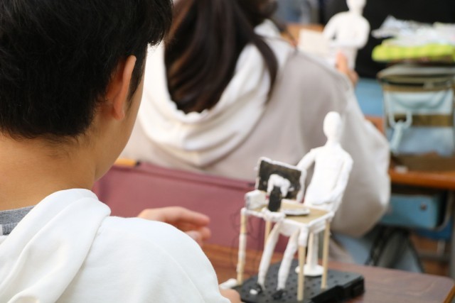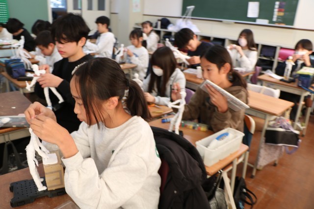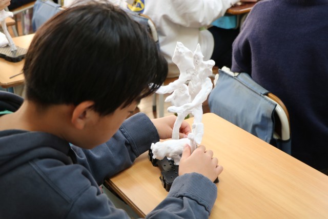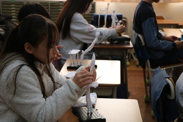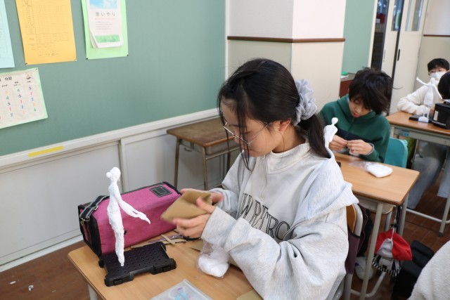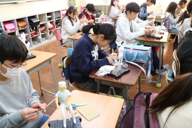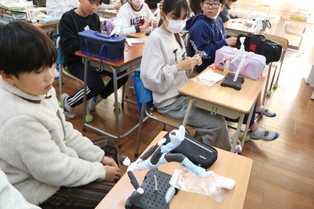 6年生図工「12年後のわたし」の様子です。12年後、自分が24歳になったときのことを想像してその姿を紙粘土で作っています。細かいところまで粘土や絵具で表現しようと頑張っています。