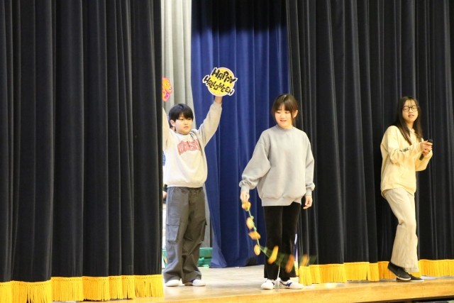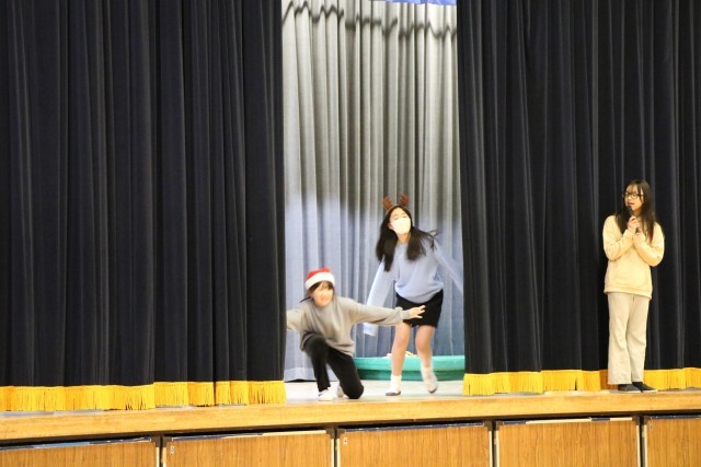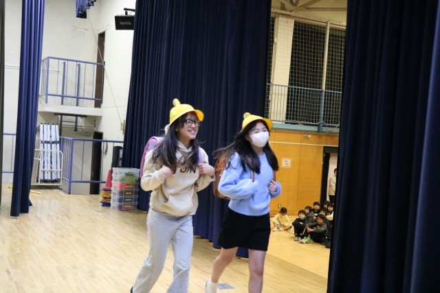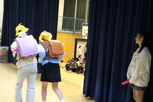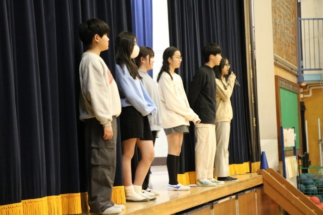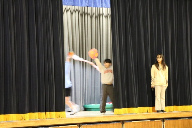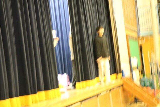 今日は集会委員会による、「何の行事でしょう」クイズ集会です。幕の間をさっと通った集会委員会が何かの行事を演技しています。その瞬間の演技や服装、小道具などから想像します。1・2学期の行事、これからある2月の行事、学校行事だけではありません。季節の行事などを思い出しながら全校で楽しく参加しました。舞台上、幕の内側ではこんな感じに、5・6年生だけでクイズを進行しています。参加する子はもちろん、やっている集会委員も楽しそうです。