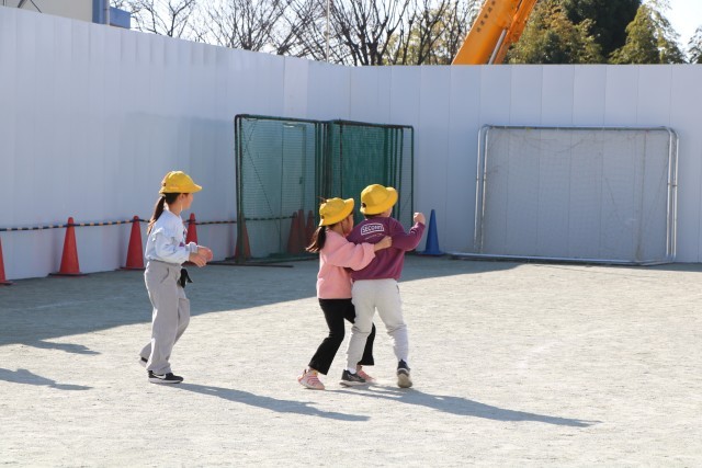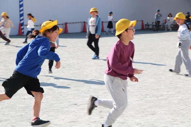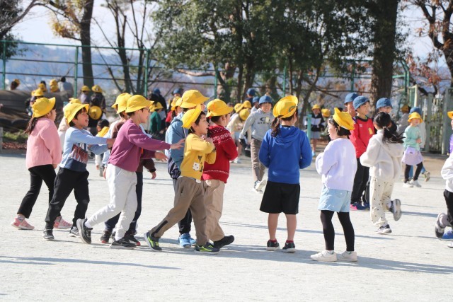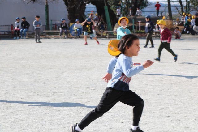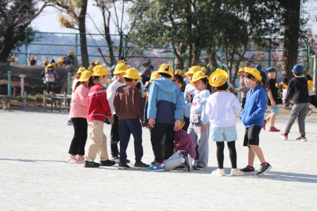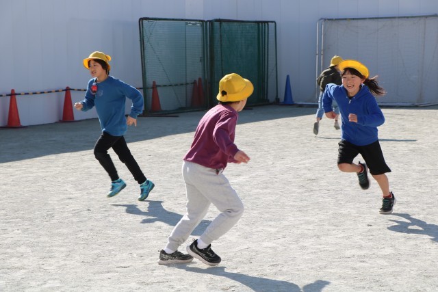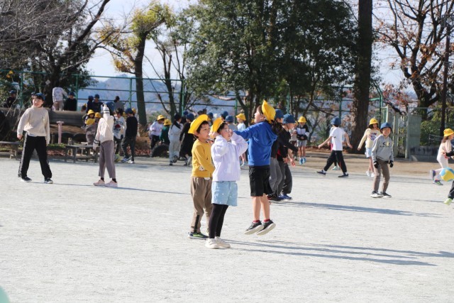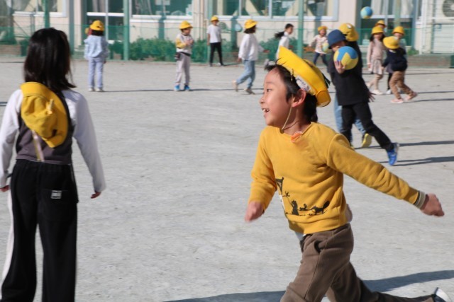 子どもたちの人気の遊びは様々ですが、砧小学校の子どもたちは鬼ごっこも大好きです。大人数で鬼を決め鬼ごっこが始まります。鬼を決めるときに鬼をやりたい子が片足を出し、みんなで足を集めて(変な表現ですが)鬼決めをします。その様子が楽しそうで、かわいいのです。青帽子が3年生、黄色帽子が2年生の様子です。大勢で仲良く遊ぶ砧っ子です。
