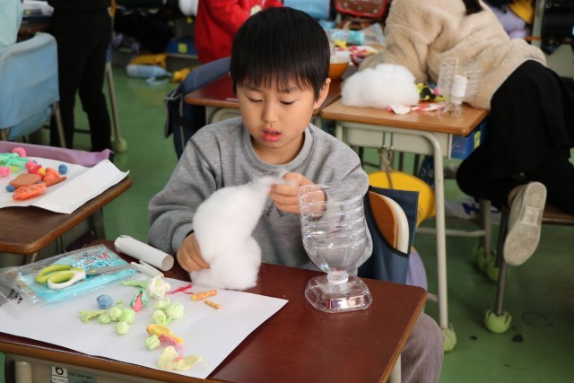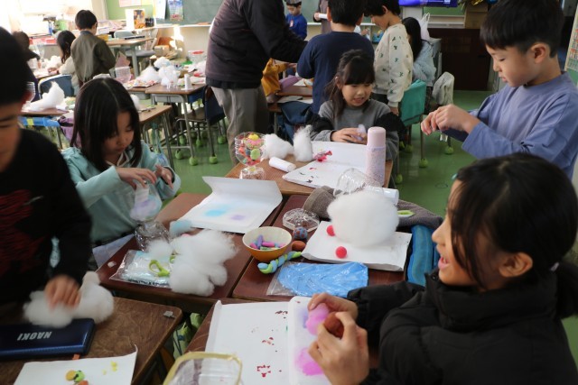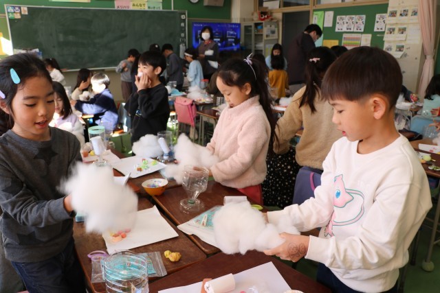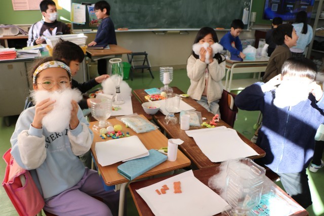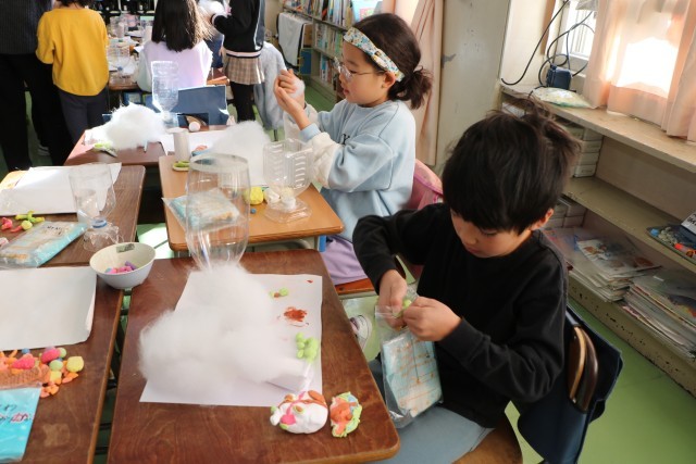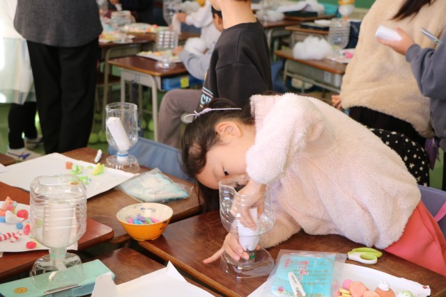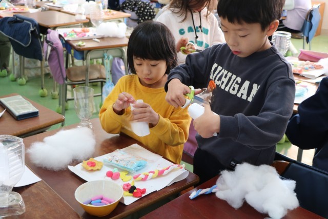 2年生図工「すてきなパフェ」の様子です。先週はパフェに入れる素材を紙粘土で作りました。今日はいよいよ完成です。子どもたちは素材の肌さわり、手触りを楽しみながら作品に一生懸命です。