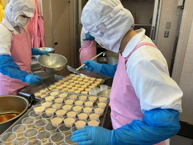 子供たちからの熱烈リクエストにより、プリンを給食室で手作りしました。「1週間前から楽しみにしてました!」とたくさんの子供たちから声をかけてもらいました。カラメルソースから手作りするので、給食室は大いそがしでしたが、とても喜んでもらえたので作った甲斐がありました。