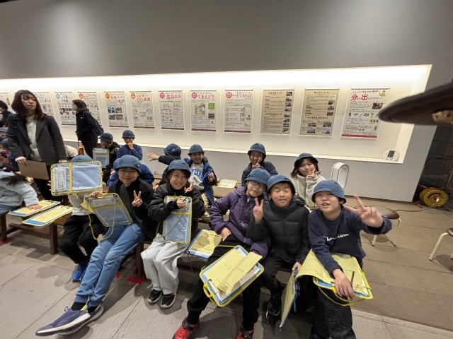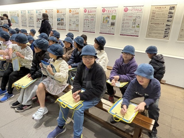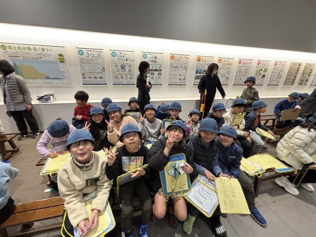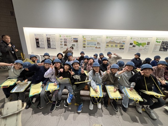 埋立処分場では、まず大きなスクリーンでゴミ処理の方法、リサイクル、地球温暖化などについて学びます。