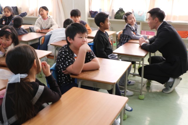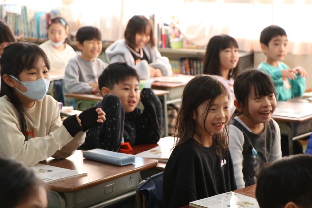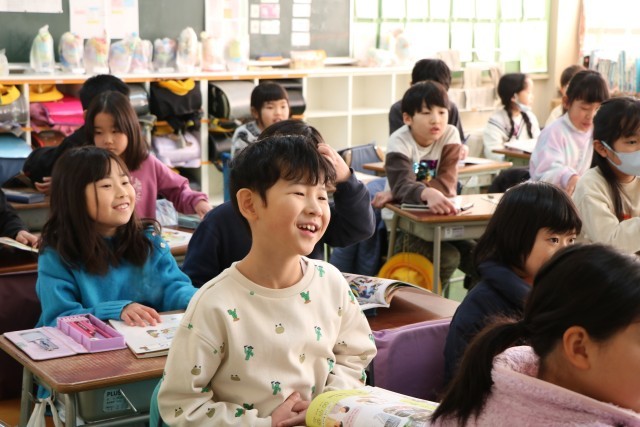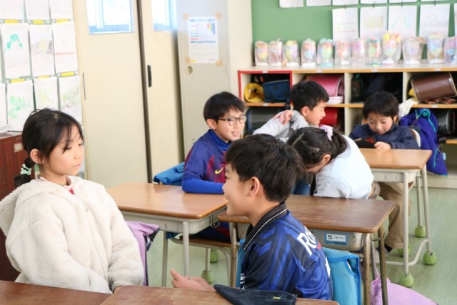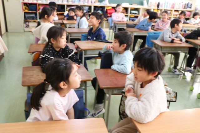 写真は2年生の様子です。担任の先生が冬休みに経験したことを楽しく聞いてから、また隣の人とペアで話を聞いてもらってからなど、いきなり全員の前で話すのがちょっと苦手…という子も安心して話ができます。