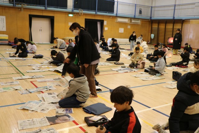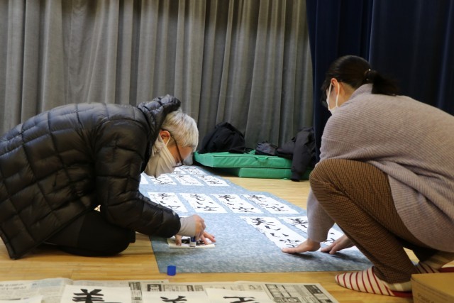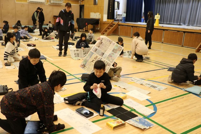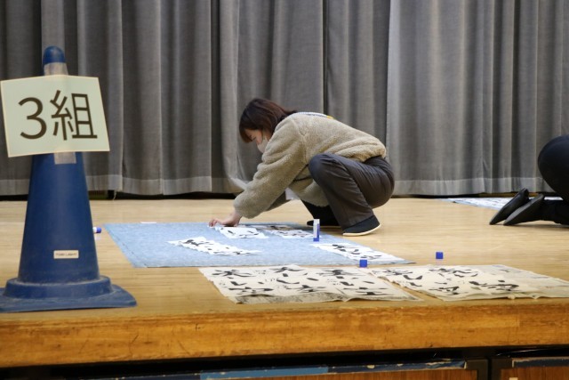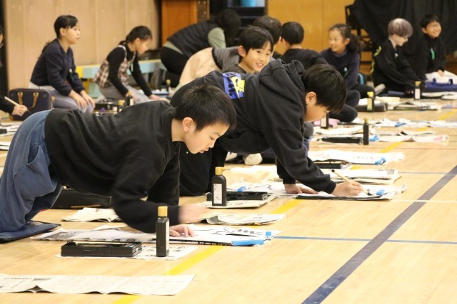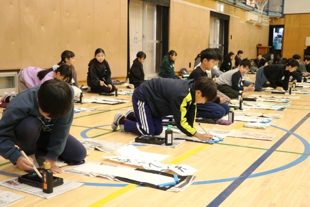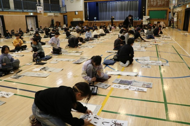3年生以上は毛筆の書初めです。体育館を使って広々と取り組みます。保護者のお手伝いの方が何人かいらしてくださいました。雲龍紙という大きな紙に子どもたちの作品を貼っていってくださいます。