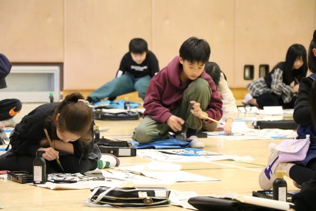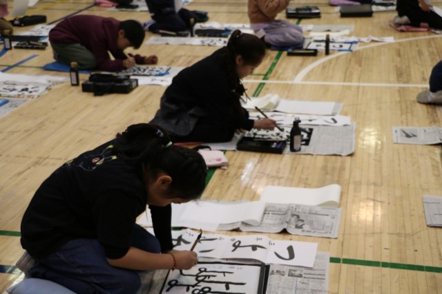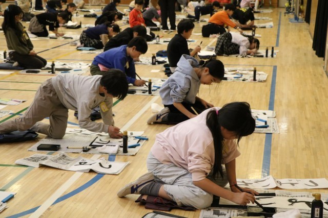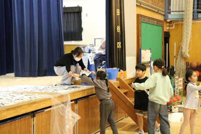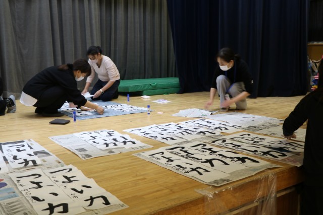 3年生も保護者の方が手伝いに来てくださっています。子どもたちがもってきた作品を丁寧に受け取り、貼ってくださいます。手渡した後もその様子を見届けている子もいました。心を込めて書いた作品には思いがたくさん詰まっているのですね。