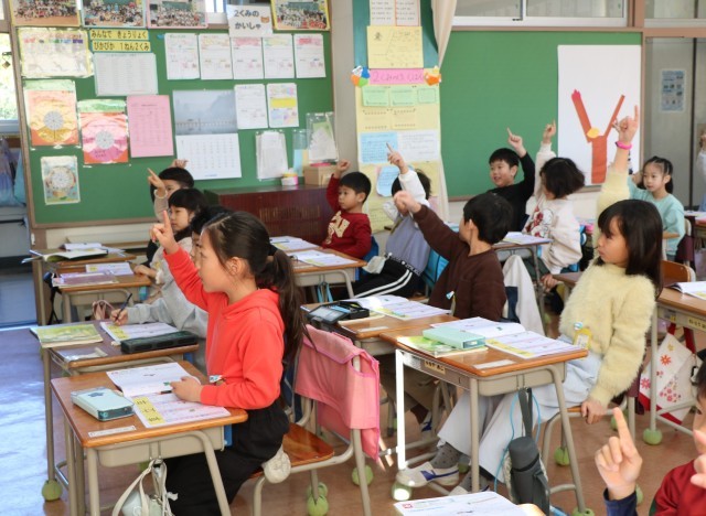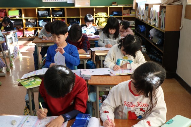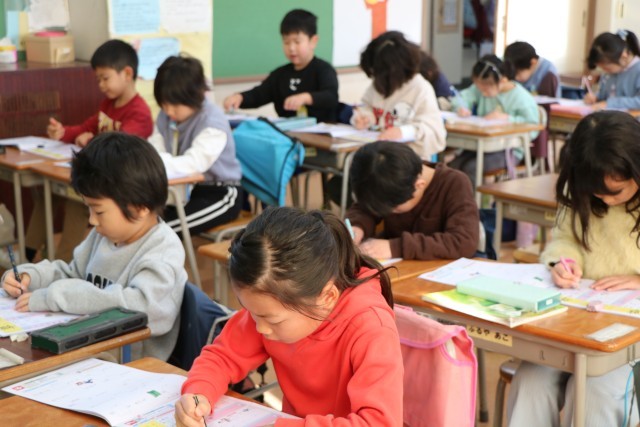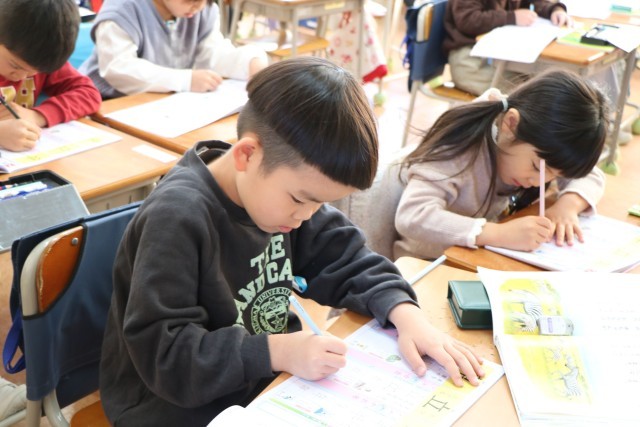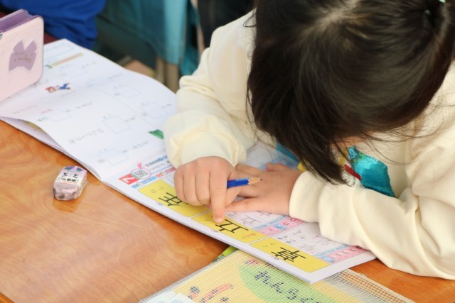 同じく1年生、新出漢字の学習の様子です。ドリルの字をなぞりながら画数を確認し、空中黒板で書き順に気をつけながら書いてみます。画数の多い漢字も増えてきました。