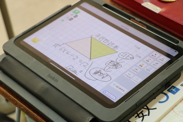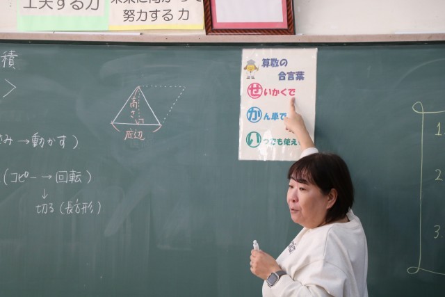 5年生算数「図形の面積」の学習の様子です。算数の問題を解くにはいろいろなアプローチがあります。それには今まで学習したことを使い、同じを見つける・違いを見つけるという活動は、数の概念や論理的思考力を育むために重要な学習プロセスです。そのうえで正確・簡単・いつでもは大切です。「せかい」を算数の合言葉に頑張る5年生です。3学期は少人数算数で3学級を4つに分けて学習しています。