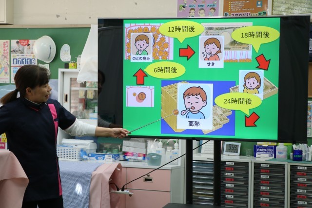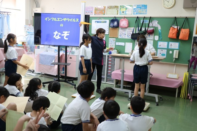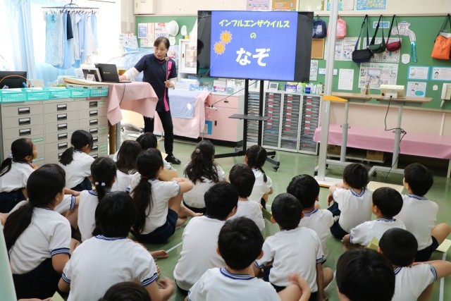 今日は3・4年生の身体計測です。「インフルエンザウイルスのなぞ」という話をしていただきました。ウイルスが私たちの体に入ったら、どのように増えていくのか、それに対して私たちの体はどのように変化していくのかというお話です。全国的に、型の違うインフルエンザが流行ってくる時期です。手洗い、うがいは大切なのだということがよくわかりましたね。
