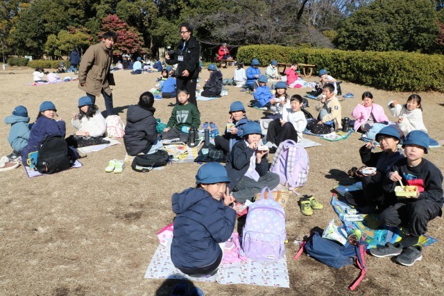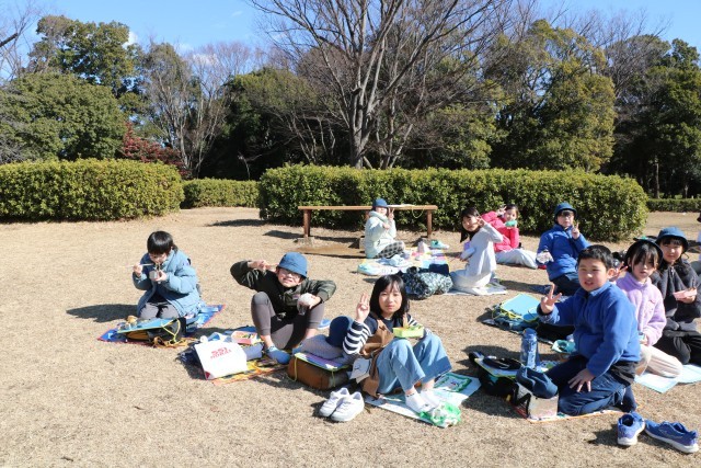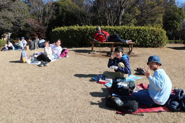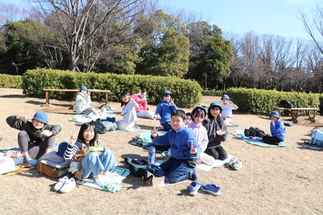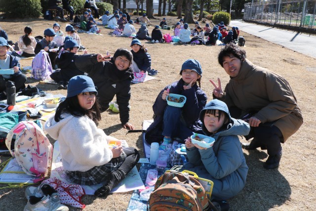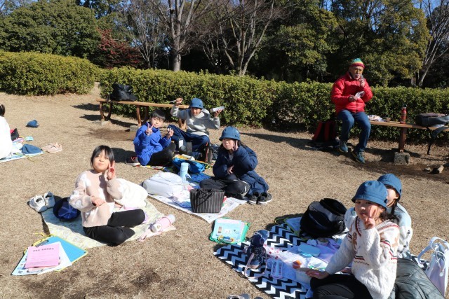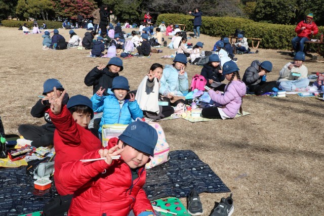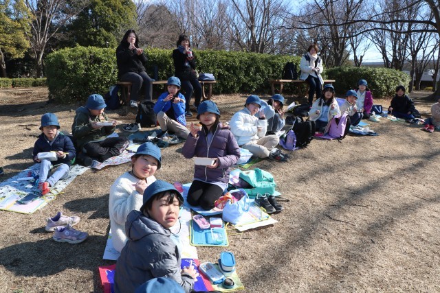 駒沢公園で楽しみにしていたお弁当タイムです。朝早くからおいしいお弁当をありがとうございます。家の方からお弁当の中にお手紙が入っていた子もいます。家に帰ったら、たくさん今日一日のことをお話してほしいです。