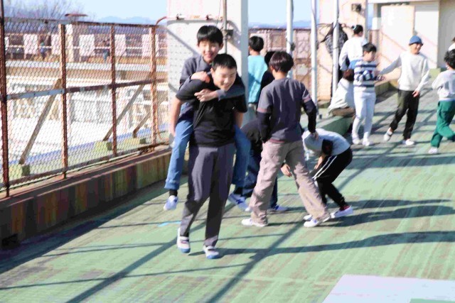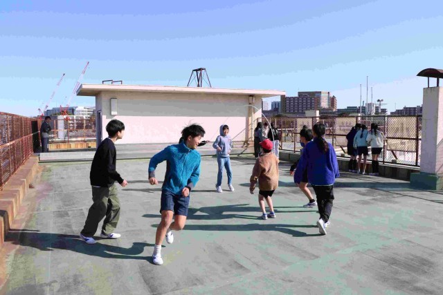 久しぶりに屋上に出て、しかも遊ぶなんて初めての子も。はじめのうちは、見晴らしのよさに気付き、四方を眺める子も少なくありませんでした。そのうち、おにごっこが始まり、縄跳びが始まり、大繩が始まり、お昼寝が始まり(これも気持ちいいものですね)。気分はとてもいいので、これから屋上でできるいろいろな遊びを考え見つけていってください。