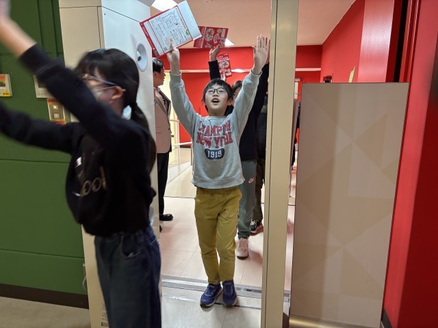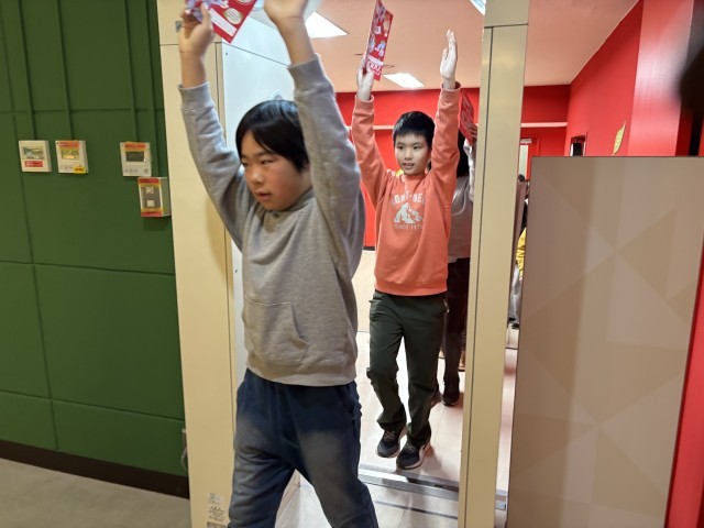 バンザイをして埃やゴミを取るエアーブローを体験しています。