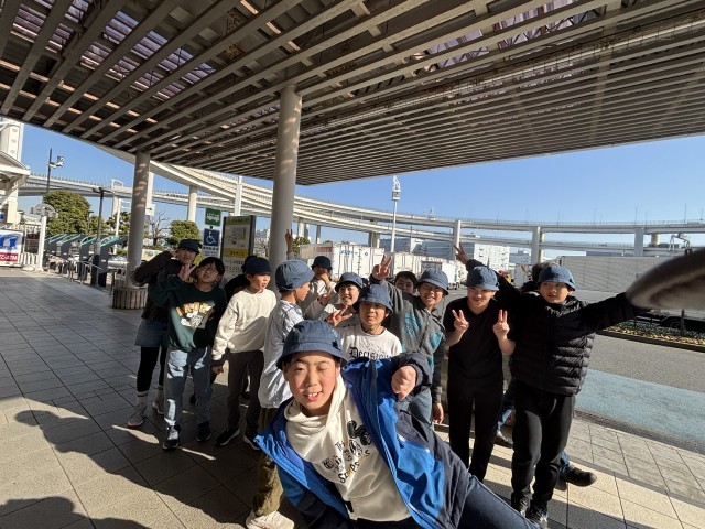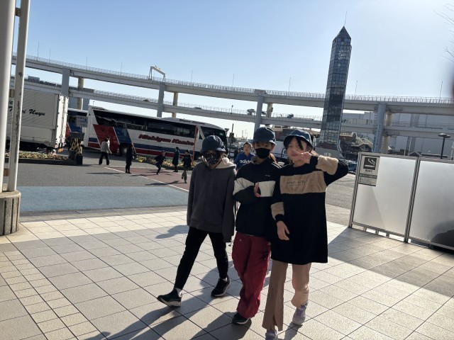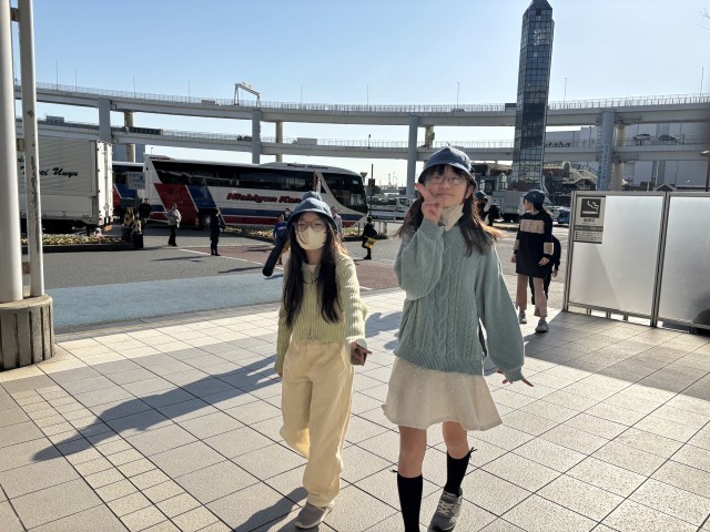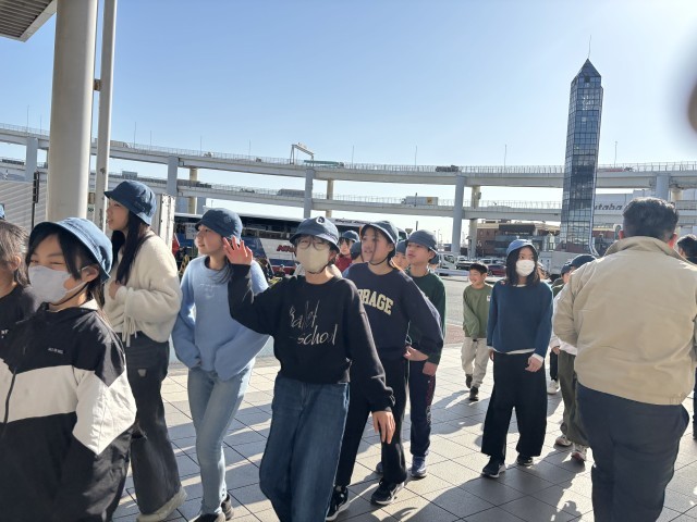 最後の見学場所大黒埠頭です。たくさんの輸出車の様子、大型船が出入りしている様子が見学できます。子どもたちは元気いっぱい、熱心に見学もしてとっても元気です。