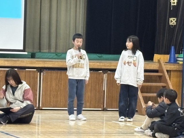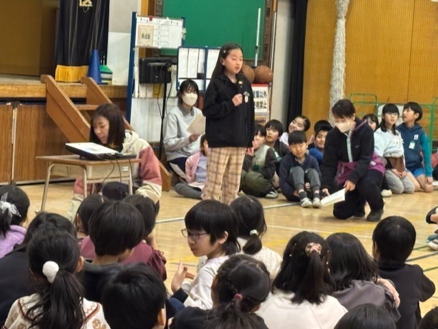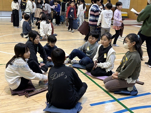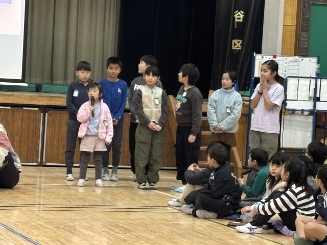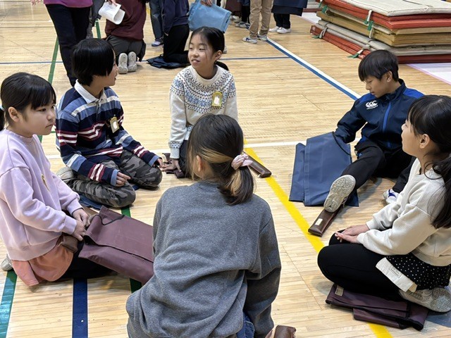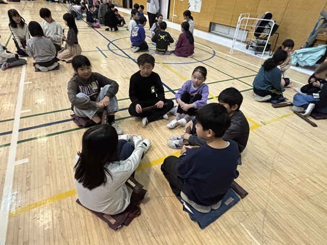 毎年4年生が取り組んでいる地域に伝わる伝統文化が「石井戸囃子」です。11月の喜多見区民祭りで発表をし、次を4年生に引き継ぎます。今日はその引き継ぎの会です。4年生の実行委員の子が会を進行しながら引き継ぎの会が進みます。実際にやってみよう・・・という時間になりグループごとに分かれました。まずは自己紹介をしあって少し緊張の様子です。
