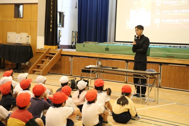 今日は、3年生陸上教室に、元陸上男子800m日本記録保持者で、ロンドンオリンピック選手である横田真人さんはじめ2人のコーチが来てくださいました。はじめに横田さんから、体育館でお話を伺いました。
