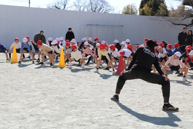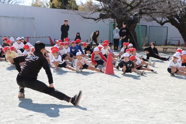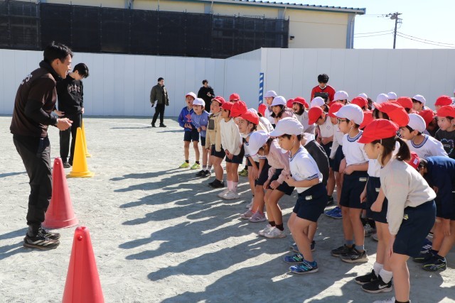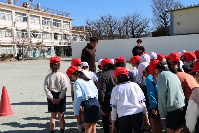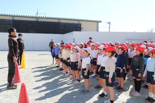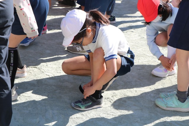 次の時間は、外に出て井原コーチから実践的なことを教えていただきます。まずは靴をしっかり履きます。靴紐、またはベルトをしっかりとめるだけで早く走る力はかなり違うそうです。コーチがそういうので間違いないでしょう。子どもたちは真剣に点検しています。