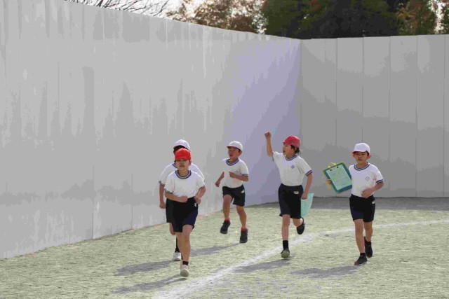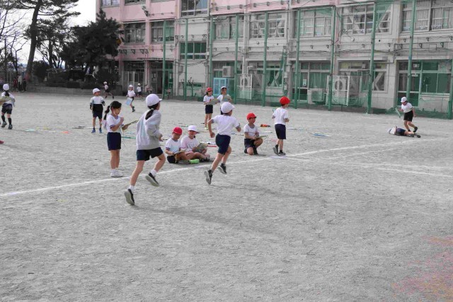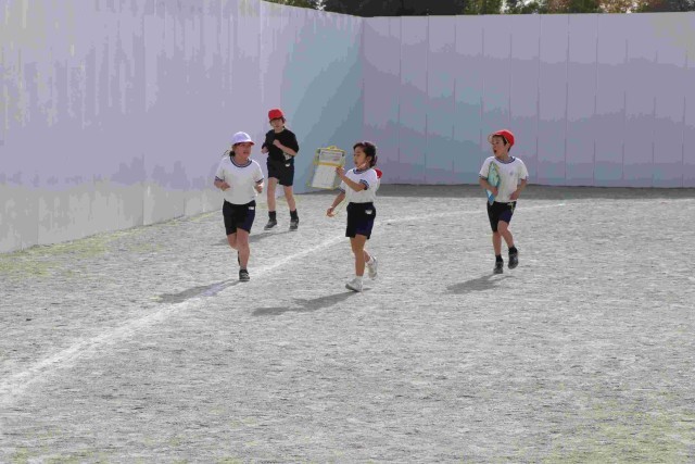 3年生は、ペアの友達(走っていない方の子)の力添えがすごいです。自分の前を通り過ぎる時、あるいは隣を走って、あと何周か・ペースはどうかアドバイスしたり応援したりしてくれます。走る方も頑張る気持ちになれますね。