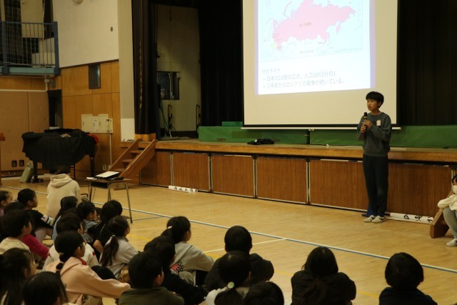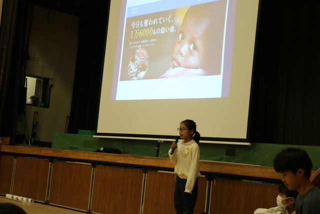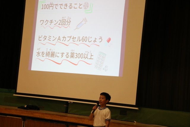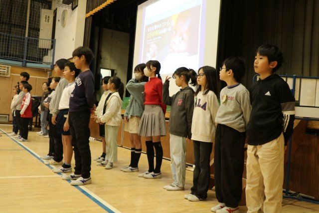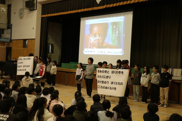 金曜日の朝は集会があります。今日は代表委員会集会がありました。来週ユニセフ募金を行います。戦争が行われている国の子どもたちの現状やユニセフ募金でどのような支援につながるのかなど、調べたことを含めて全校の砧っ子に呼びかけました。最後に♪君の手と僕の手を 固く握り~と「心から心へ」の歌を歌って終わりました。