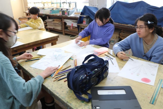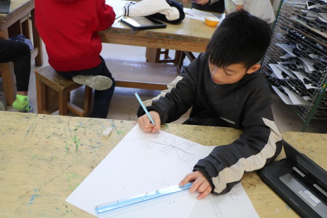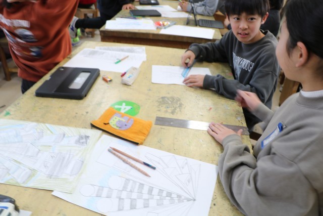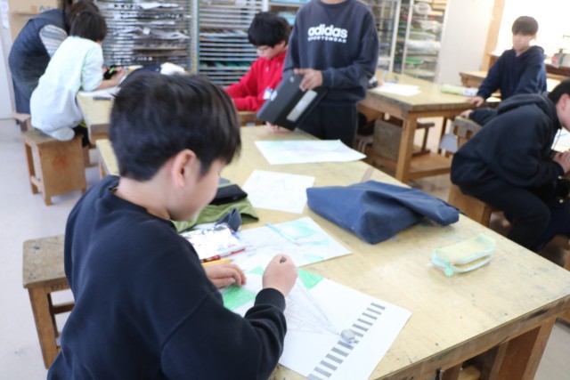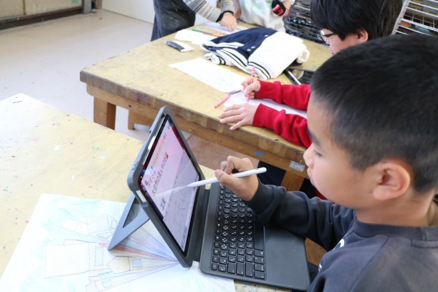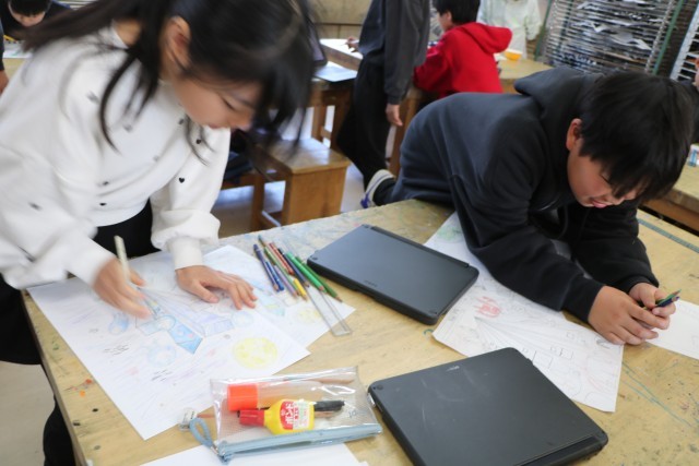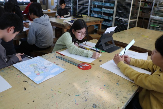 5年生図工「私の町の秘密教えます」の様子です。一点透視図法を使って、鳥の目から見た町の様子を描きます。自分の作品に集中して取り組んでいます。完成したらタブレットで振り返りカードを書いて提出します。振り返りカードには、作品の見所や苦労したところ、こんな思いで描いたんだという自分の気持ちなど記入します。