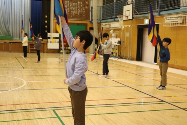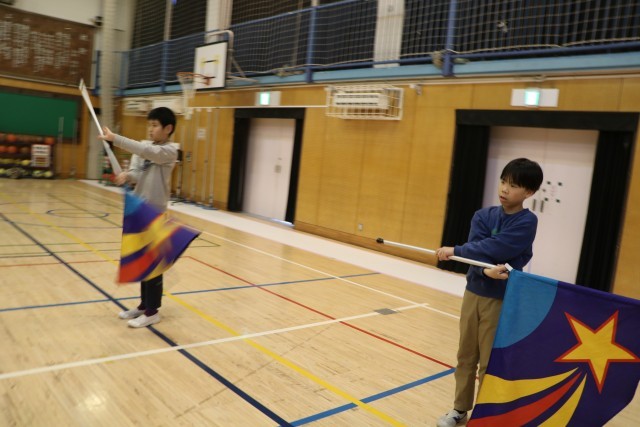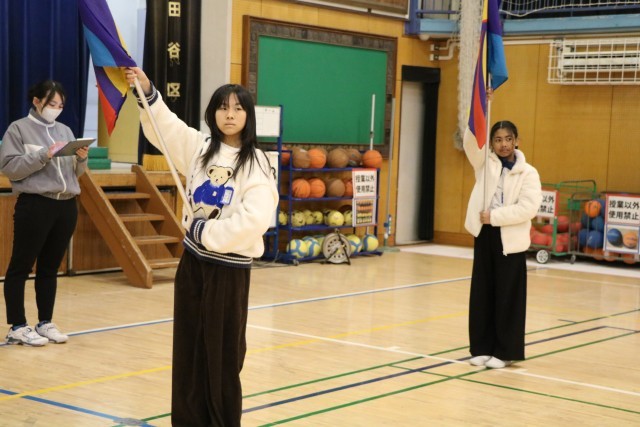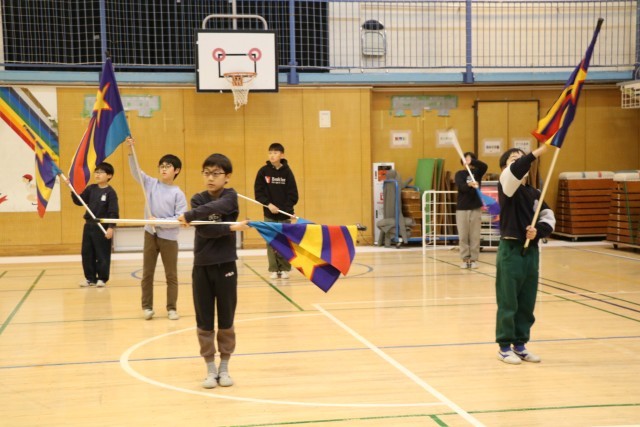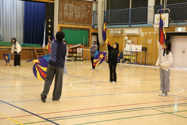 フラッグ、メジャードラムのレッスンでは、腕をしっかり伸ばして肘を固定し大きく切れよく振ることを教えていただきました。胸をはって立ち、ポーズをとったときもお尻が出ないよう一直線の姿勢が美しいのです。・・・だそうです。