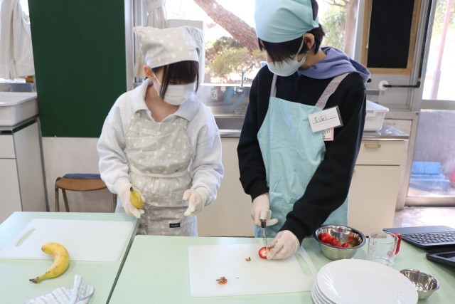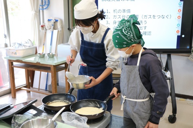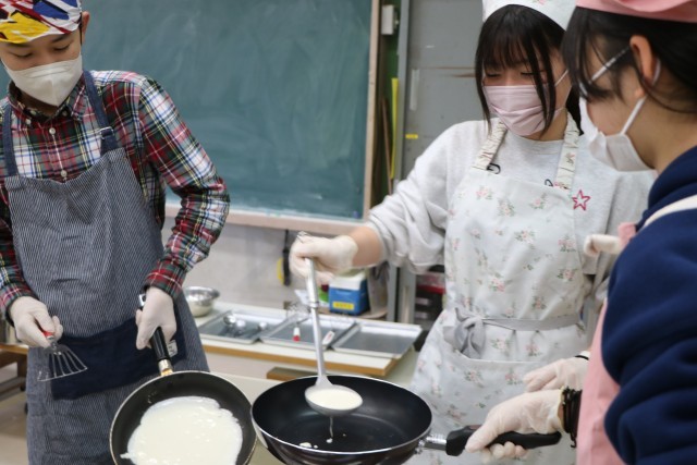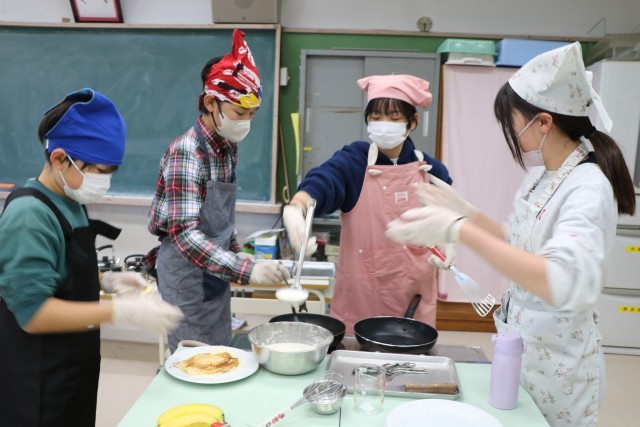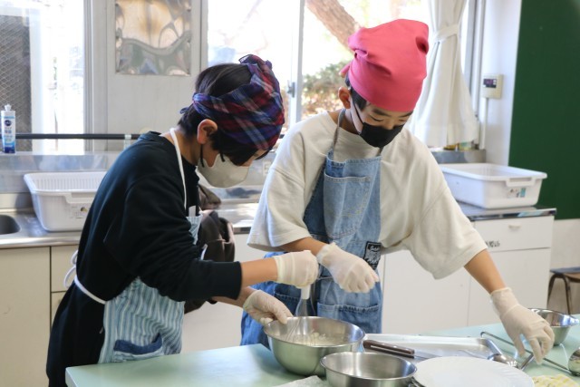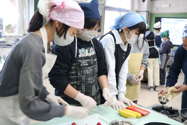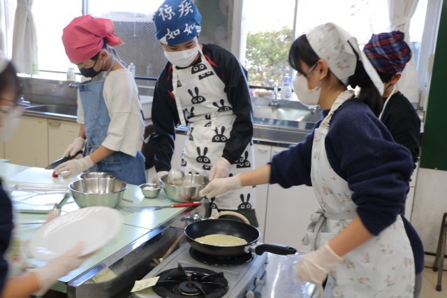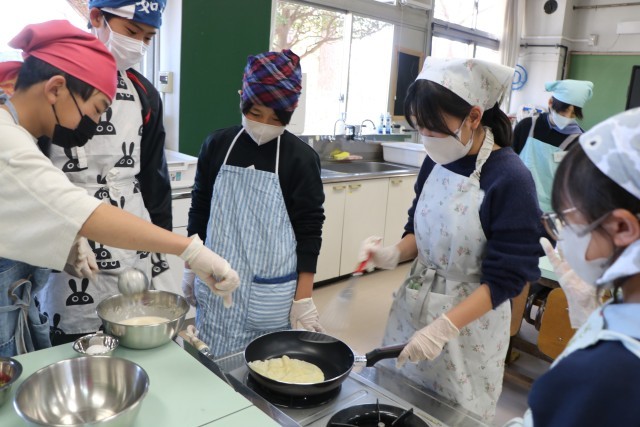 6年生家庭科、こちらも「おやつ作り」の様子です。6年生は材料はほぼ統一で、班ごとに調べ相談したメニューでおやつ作りに挑戦です。
