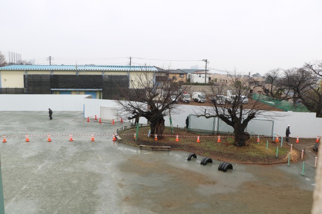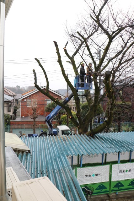 体育館への渡り廊下横の、桜の枝伐採も始まっています。