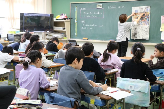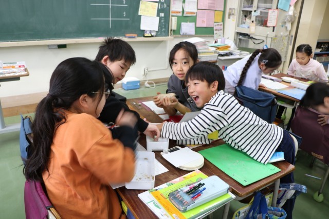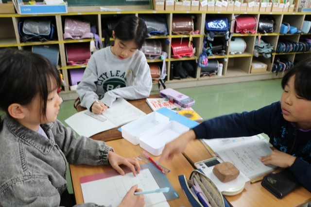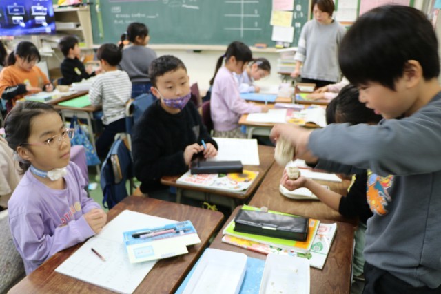 3年生理科「ものの重さ」の学習です。身の回りのものを手で持ったり、はかりを使って重さを比較したりして、重さの概念(形と重さ、体積と重さ)を学習します。今日は、形を変えても重さは変わらないか?という学習です。粘土を使って、班ごとに実験開始です!