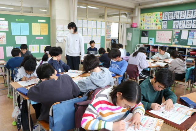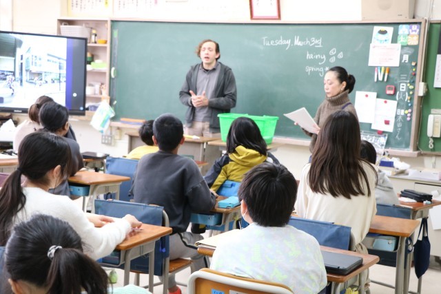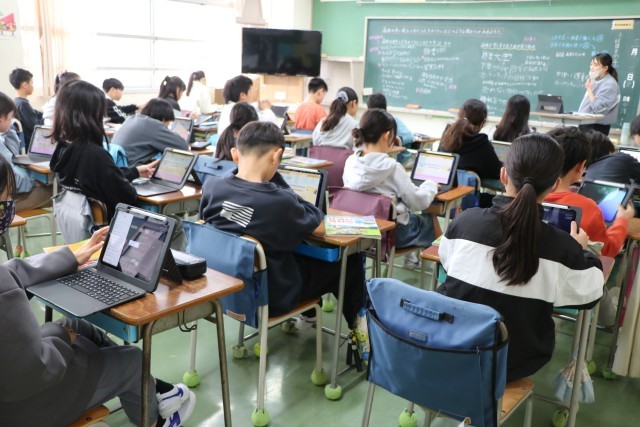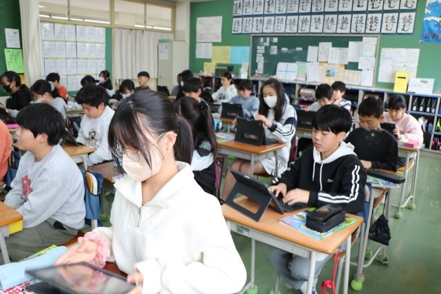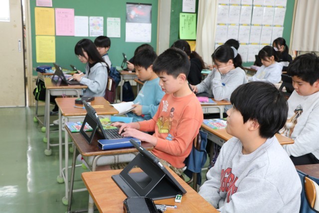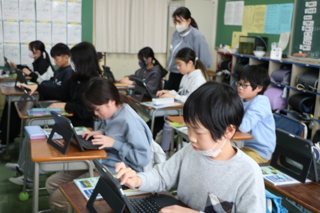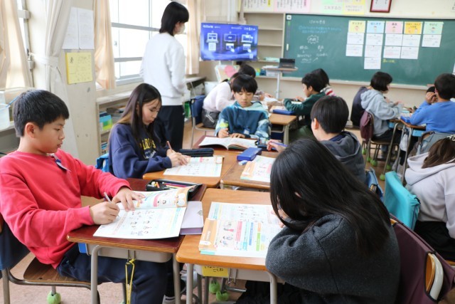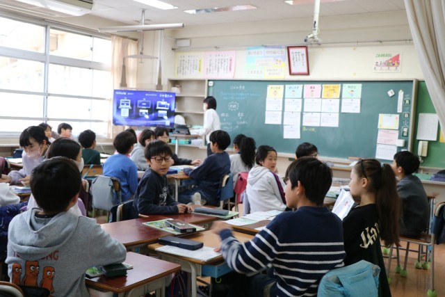 5年・生外国語、保健、社会の学習の様子です。どのクラスも友達の発表の時は発表者に、先生の話の時は先生に体を向けて注目して話を聞いています。
