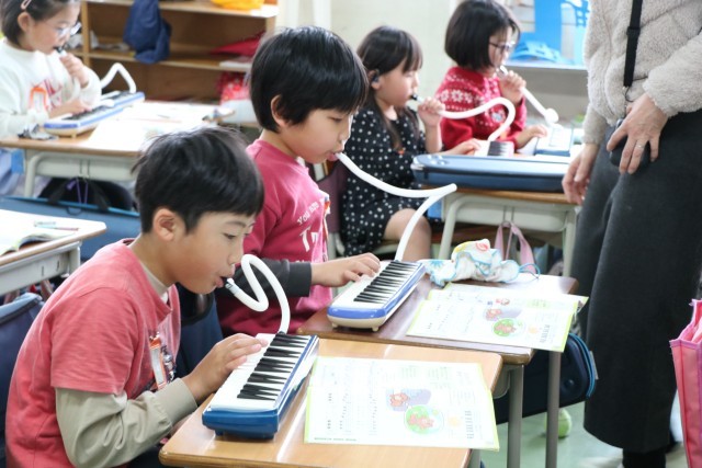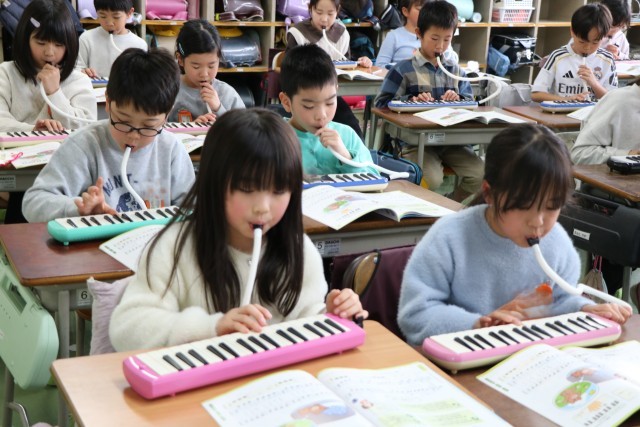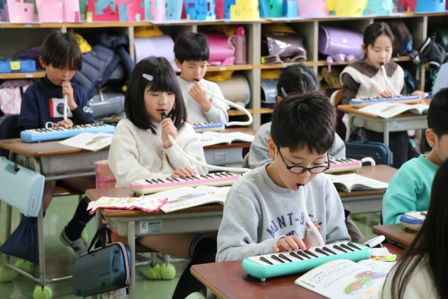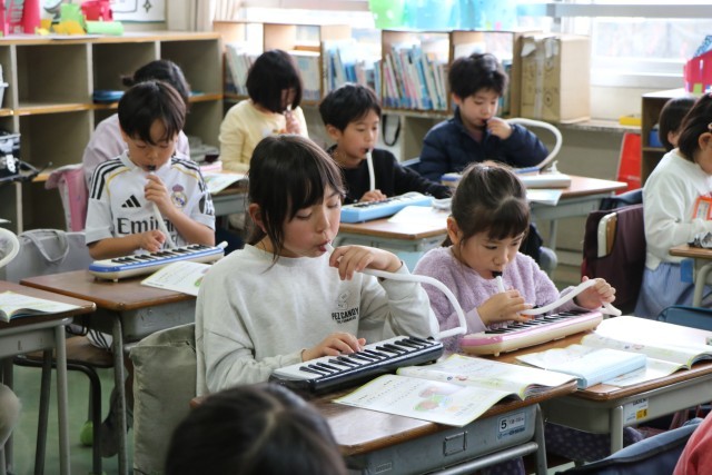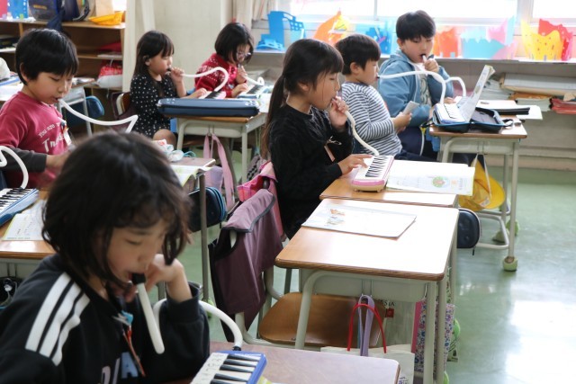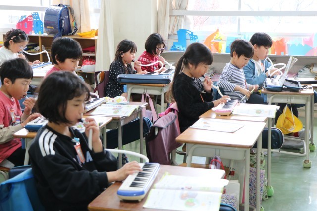 2年生音楽の様子です。みんなで練習するときは友達の音も聞きながら、自分で練習するときは指遣いを確認しながら、一生懸命演奏しています。主旋律と副旋律2パターンある曲なので、合わせて合奏するのが楽しみな曲です。一生懸命練習する姿も感心しましたが、個人練習して音がたくさん響いているときに先生が話そうとしたとき、それにいち早く気が付いた子が「みんな!音ストップ!練習ストップ!」と、声をかけ合い静かになっていきます。当然ながら、ふざけたり、わざと大きな音を必要以上に出し続ける子は一人もいません。みんなで一緒に学習することの楽しさを理解しているからこそ!すてきな2年生に成長していることに感心!・・とっても嬉しくなりました。
