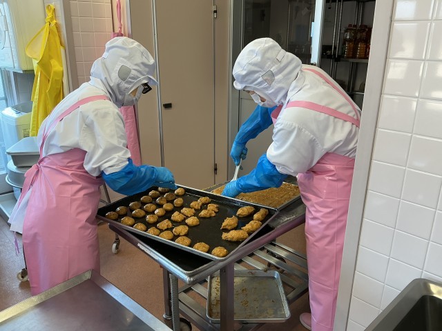 今日の給食は6年生のリクエストメニューです。サーターアンダギーは620個、手作りしました。