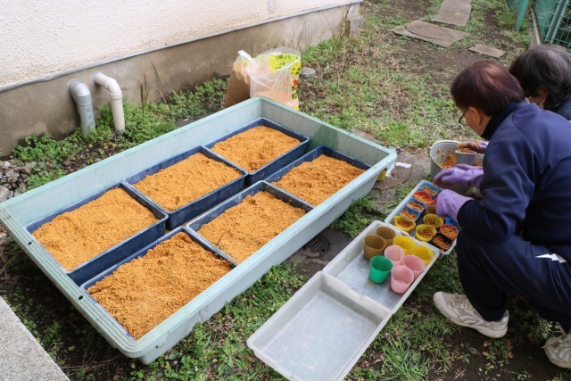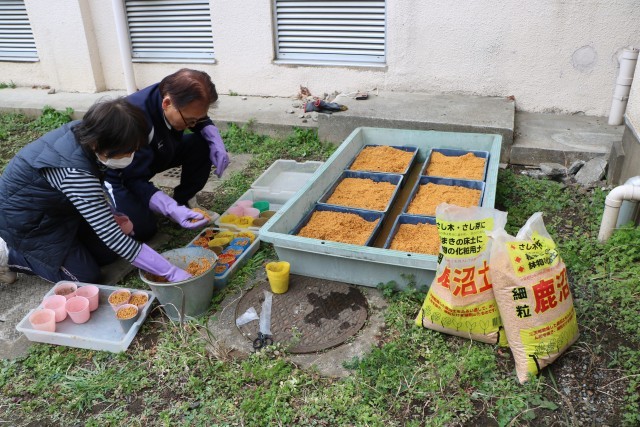 写真は先週金曜日の体育館渡り廊下の様子と、1年生と一緒に挿し木をする準備をしている主事さんの様子です。