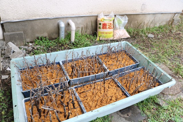 挿し木をした四角いバットは、直射日光の当たらないところで水をあげながら様子を見ています。