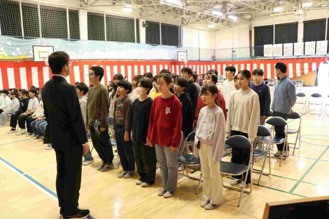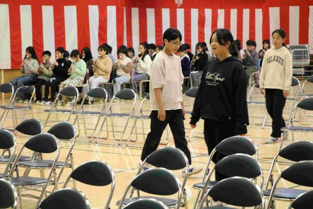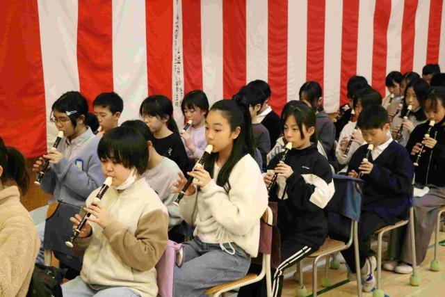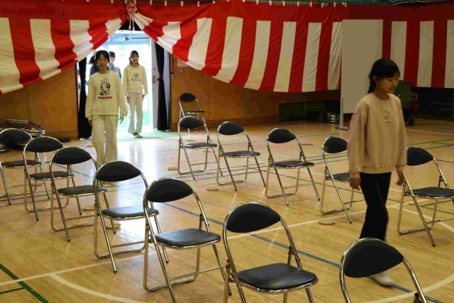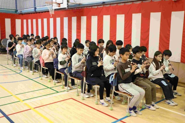 今日の午後は卒業式のリハーサルが行われました。写真は、5年生のリコーダー演奏に合わせて入場するところです。