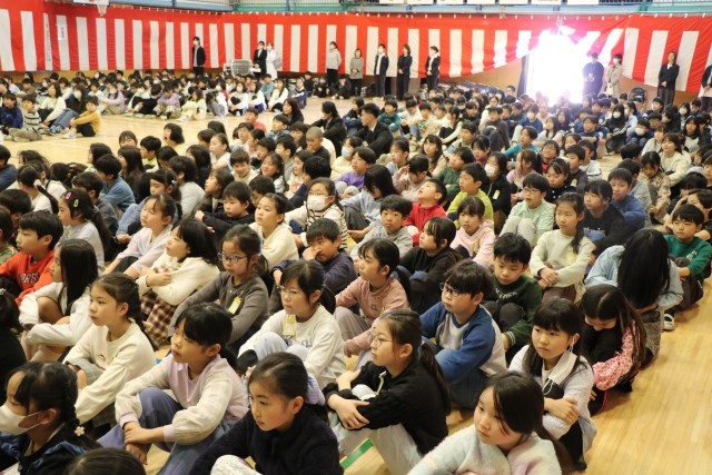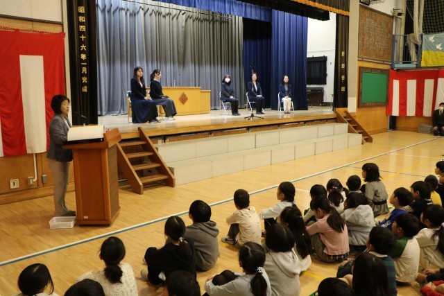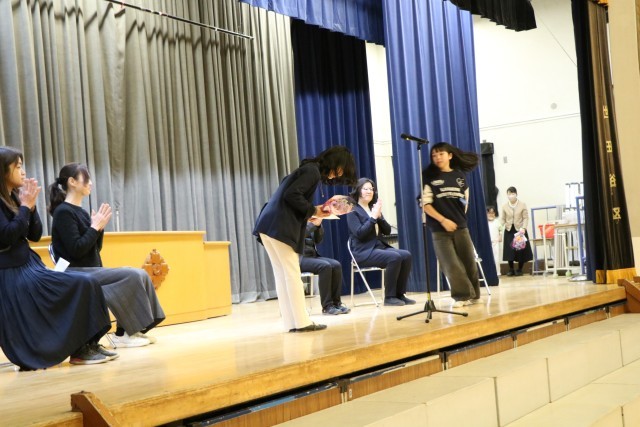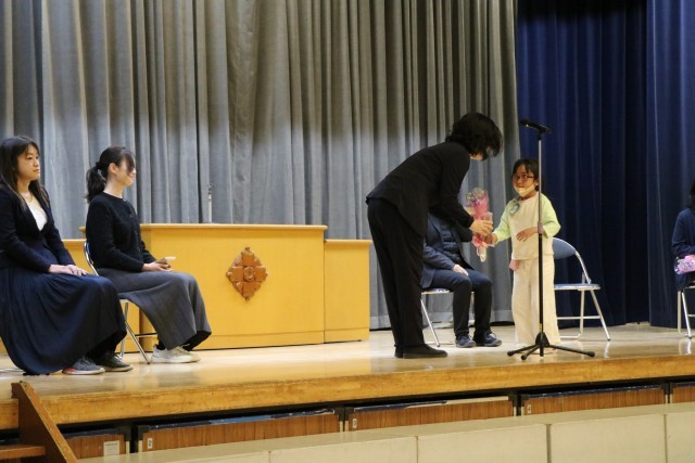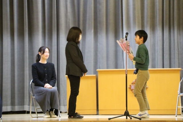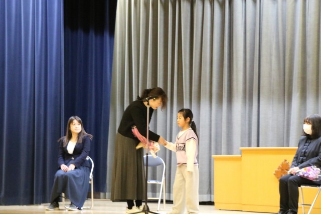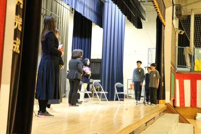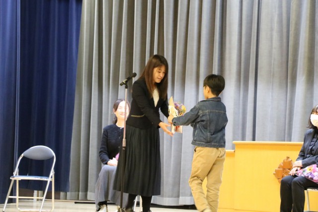 修了式の後、6年生も体育館に入り離任式を行いました。離任される先生方を拍手で迎え、代表児童がお別れの一言を添えてお花を渡し、お一人お一人からお言葉をいただきました。