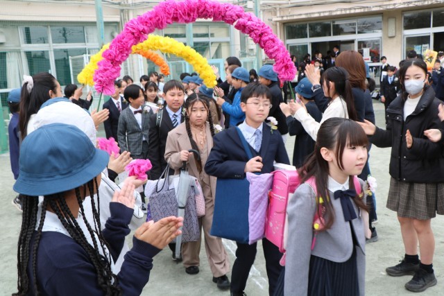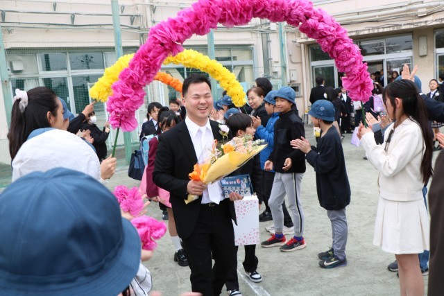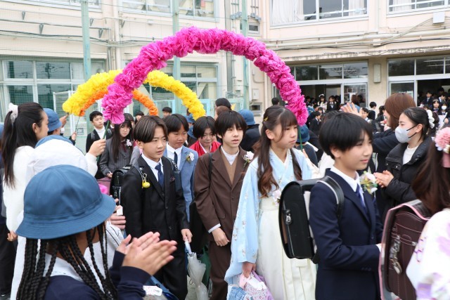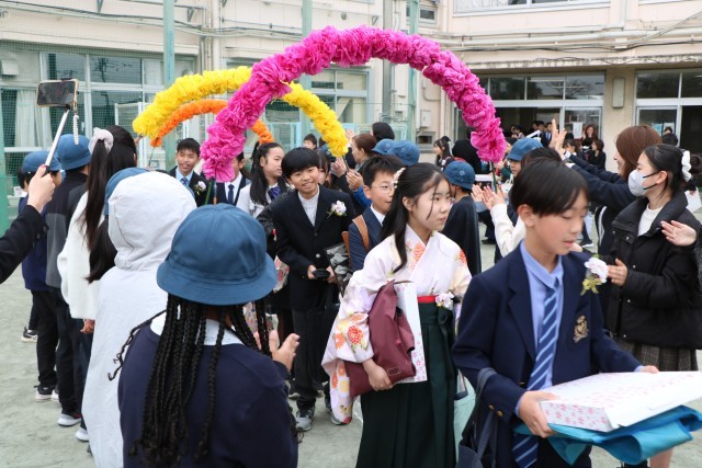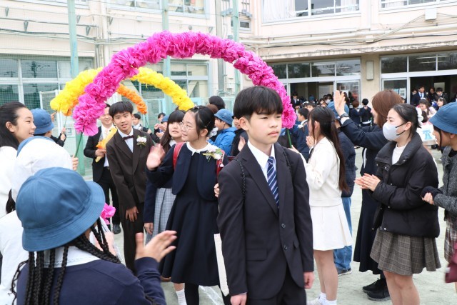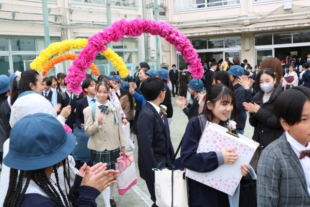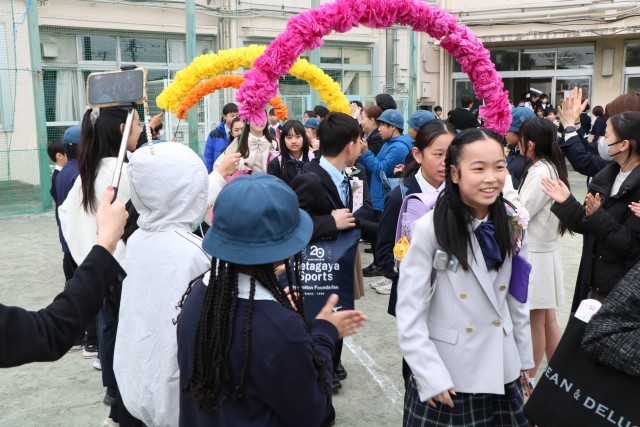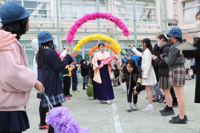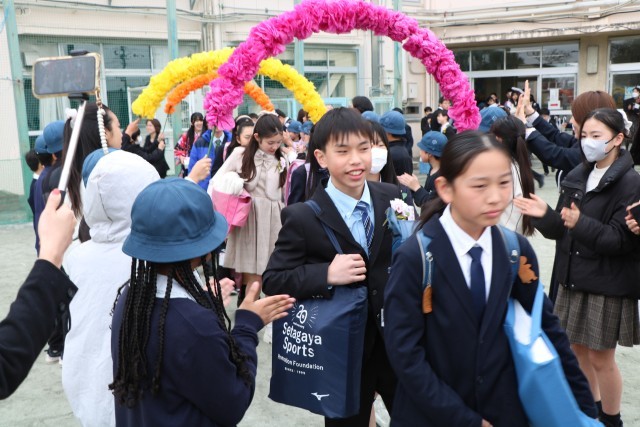 教室で最後の先生からの言葉を聞き、いよいよ門出送りです。5年生、保護者の皆様、教職員が校庭で花道を作りその中を歩いて行く卒業生です。