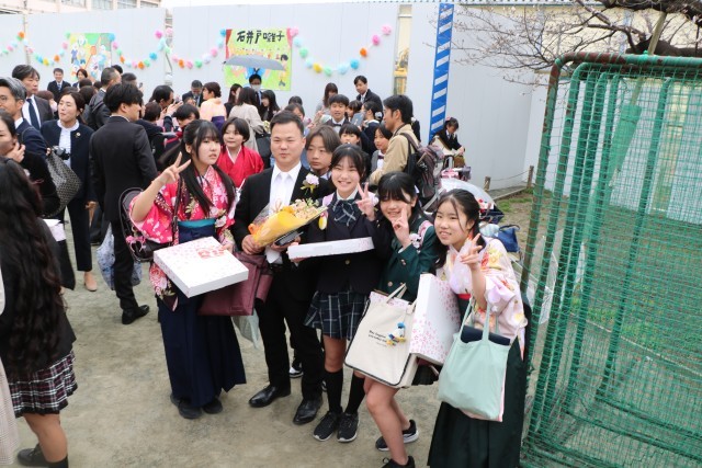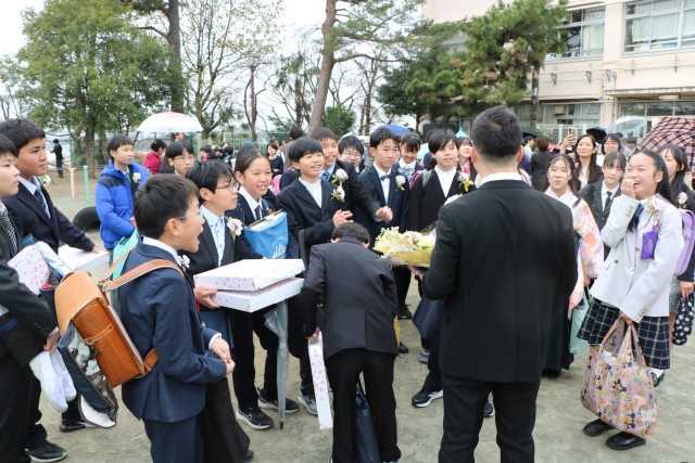 校庭は、門出送りの花道を通り終わった後も名残惜しい卒業生で賑やかです。