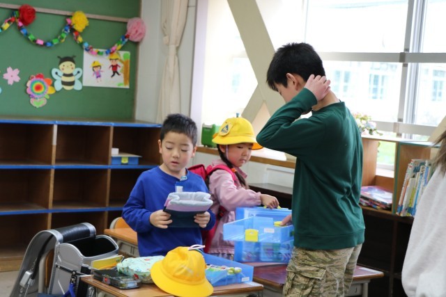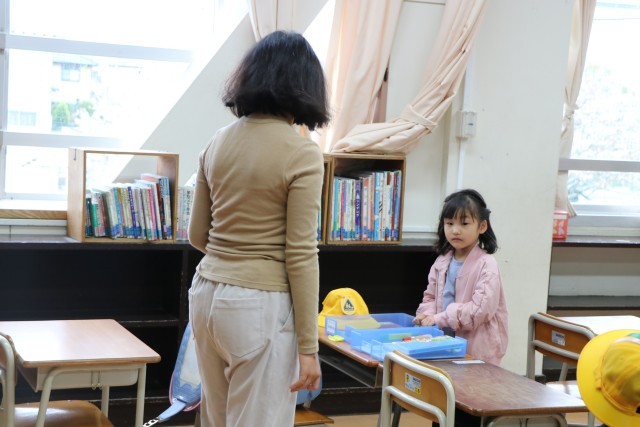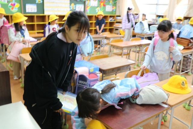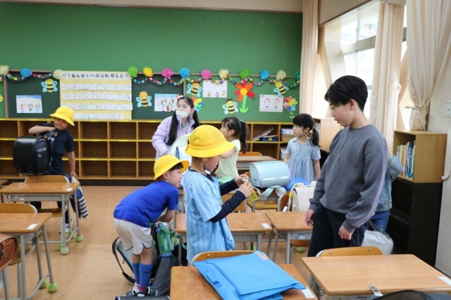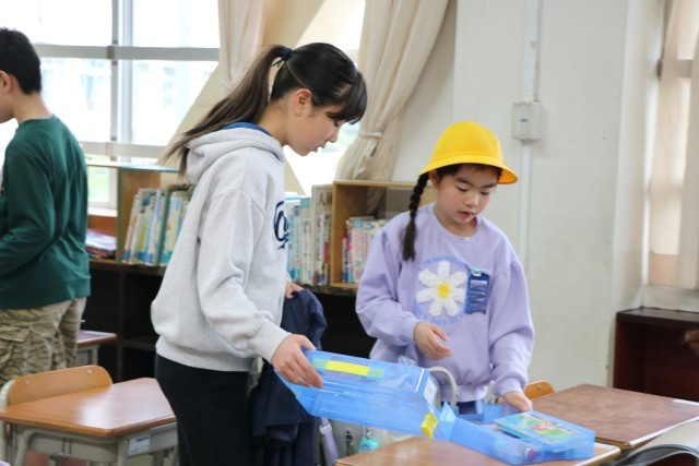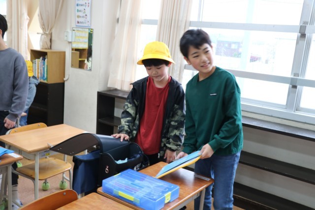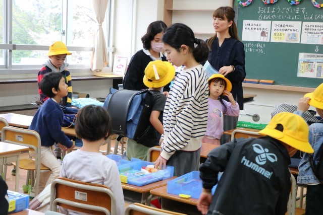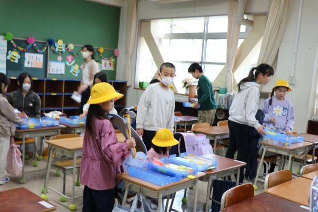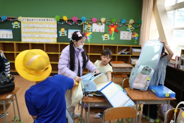 教室では、黒板に書いてある一連の朝の支度を6年生が手伝ってくれます。ランドセルから物を出す。机の中にしまう。提出物は先生の机の上に出す。空になったランドセルに黄色い帽子を入れる。やることがたくさんありますが、6年生が声をかけたり手伝ったりしながら、1年生頑張っています。