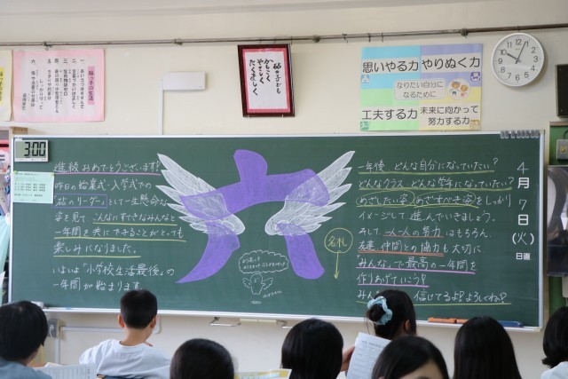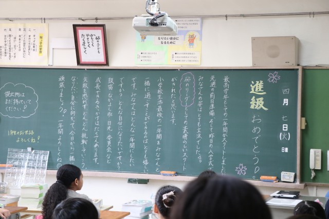 教室の黒板には先生たちからの熱いメッセージが書いてあり、子どもたちを迎えました。中学校の卒業式に行っている間に消してしまった学級もあったので、一部だけご紹介します。
